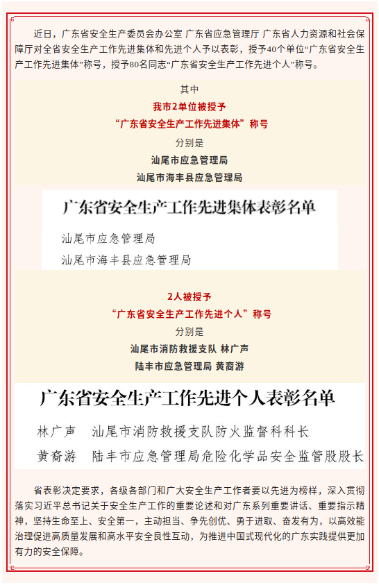 喜訊!汕尾市2單位獲“廣東省安全生產(chǎn)工作先進(jìn)集體”稱(chēng)號(hào)、2人獲“廣東省安全生產(chǎn)工作先進(jìn)個(gè)人”稱(chēng)號(hào)