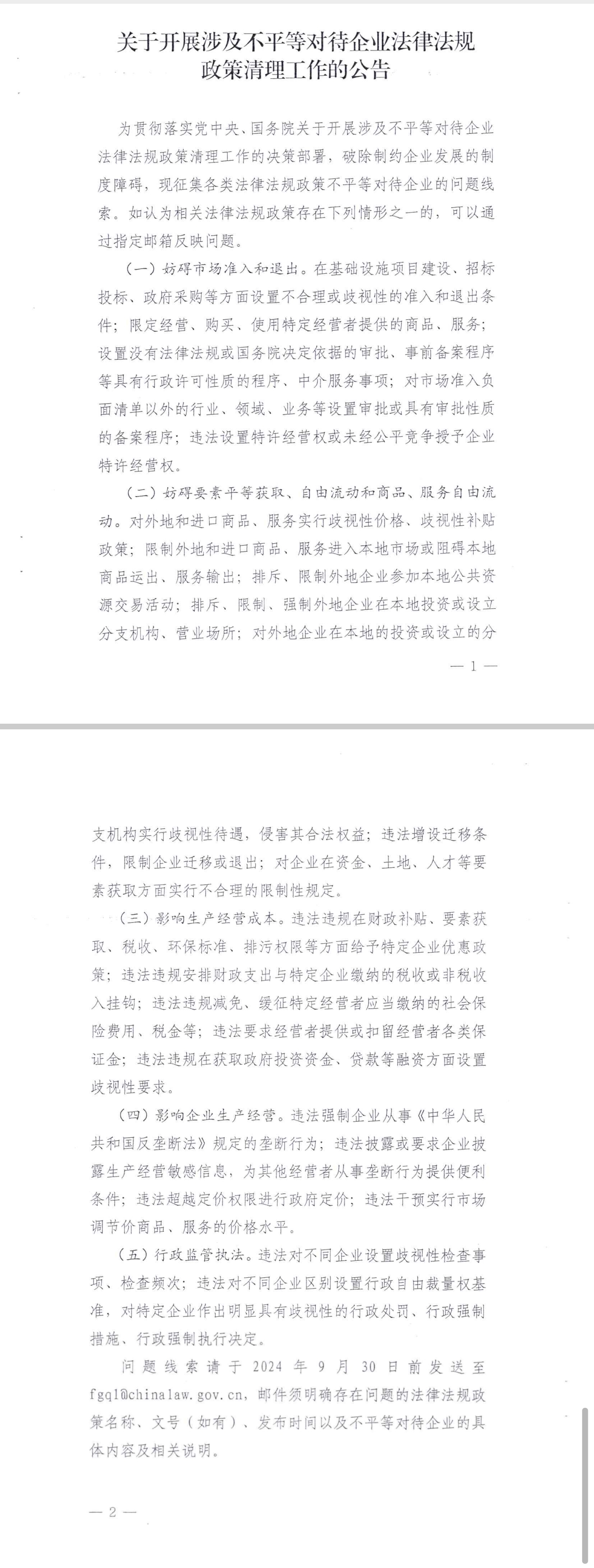 關(guān)于開展涉及不平等對待企業(yè)法律法規(guī)政策清理工作的公告