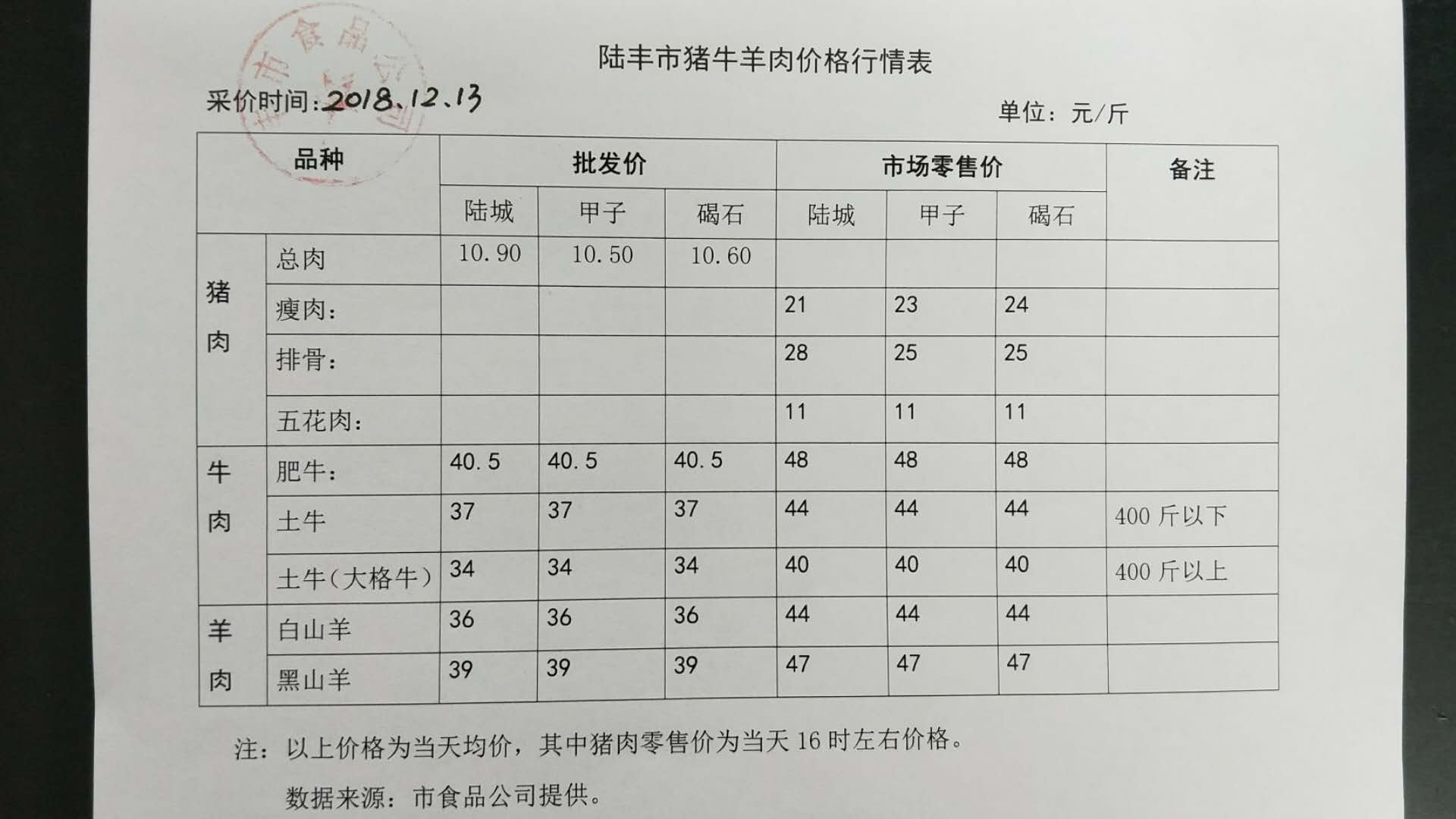 陸豐市豬牛羊肉價格行情表(2018年12月13日)