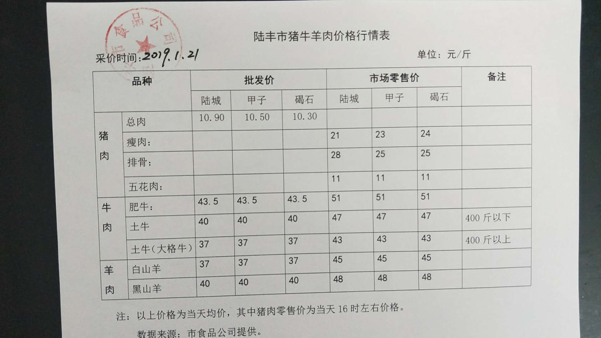 陸豐市豬牛羊肉價(jià)格行情表(2019年1月21日)