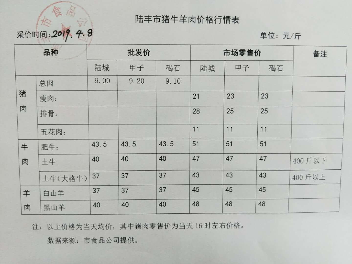 陸豐市豬牛羊肉價(jià)格行情表(2019年4月8日)