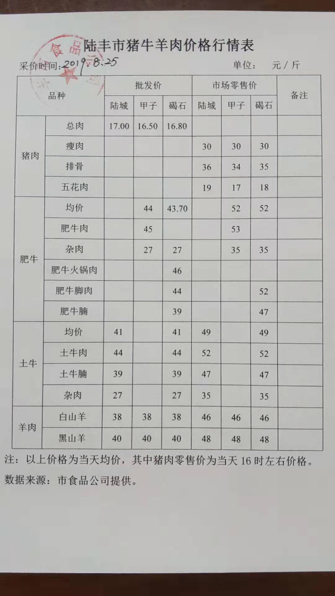 陸豐市豬牛羊肉價(jià)格行情表(2019年8月25日)