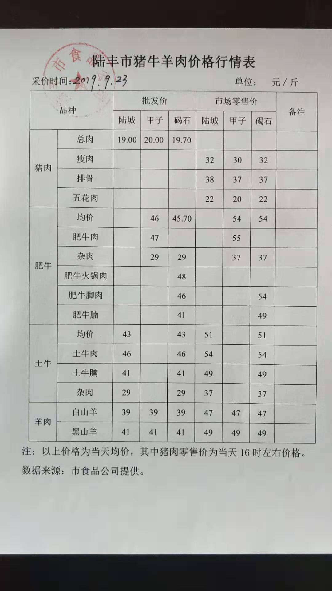 陸豐市豬牛羊肉價格行情表(2019年9月23日)