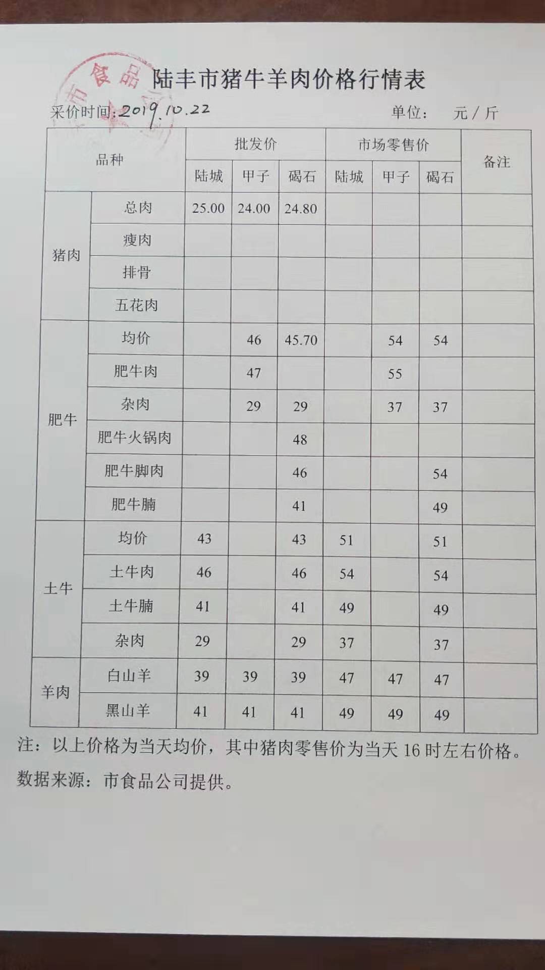 陸豐市豬牛羊肉價(jià)格行情表(2019年10月22日)