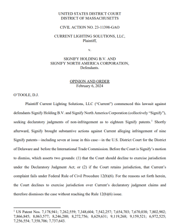 2023年,Current率先在美國馬賽諸薩州地方法院提起確認(rèn)不侵權(quán)之訴(案號(hào):1:23-cv-11398),尋求法院宣布其未侵犯Signify的LED相關(guān)專利。Signify隨即在美國特拉華州地方法院向Current提起2起專利侵權(quán)訴訟(案號(hào):1:23-cv-00767、1:23-cv-00769),并同時(shí)在美國國際貿(mào)易委員會(huì)提起337調(diào)查(調(diào)查編碼:337-TA-1371)。
