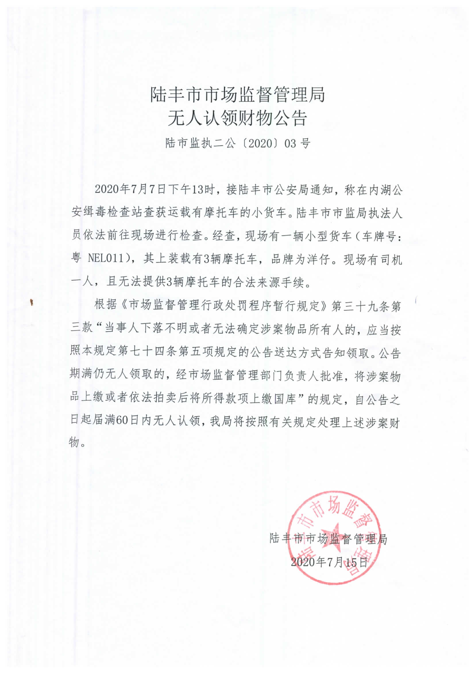 陸豐市市場(chǎng)監(jiān)督管理局無(wú)人認(rèn)領(lǐng)財(cái)物公告