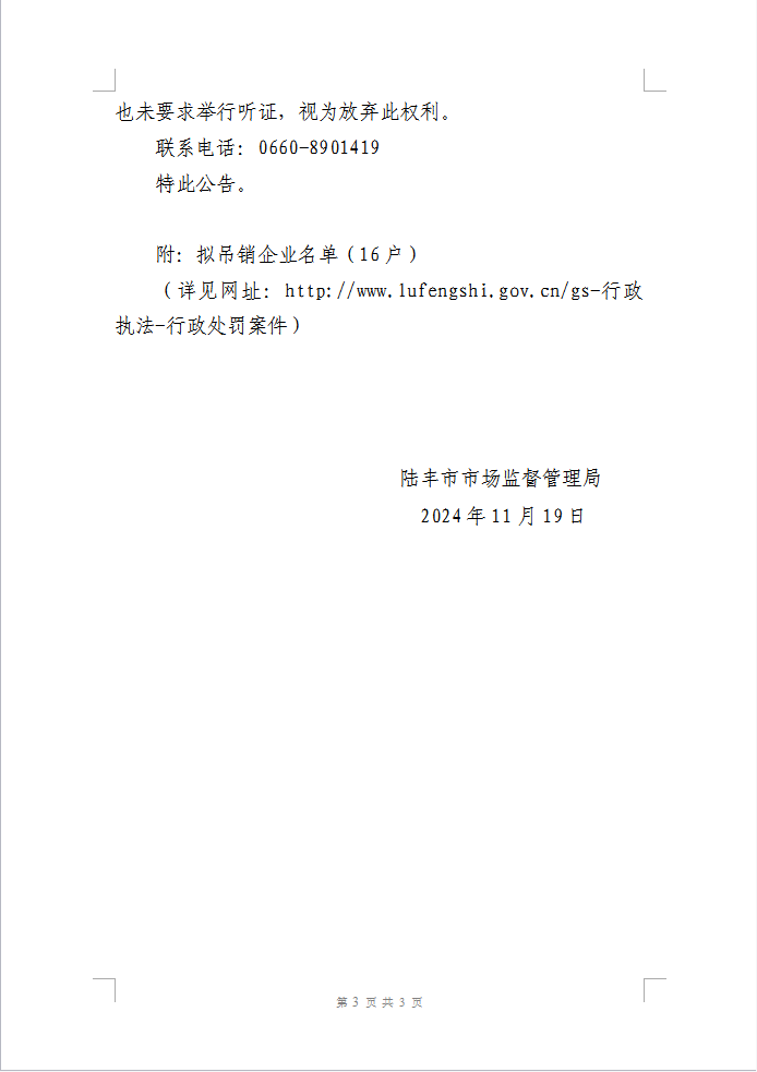 陸豐市市場監(jiān)督管理局關(guān)于吊銷長期停業(yè)未經(jīng)營公司行政處罰告知公告