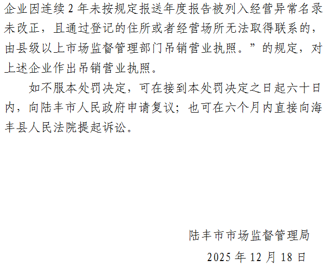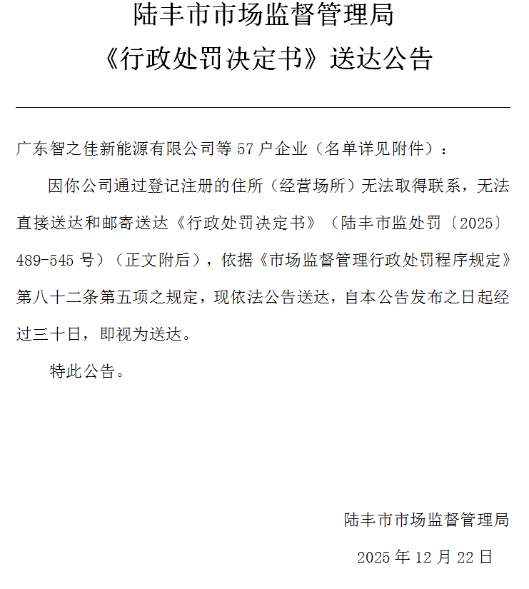 陸豐市市場監(jiān)督管理局《行政處罰決定書》送達公告