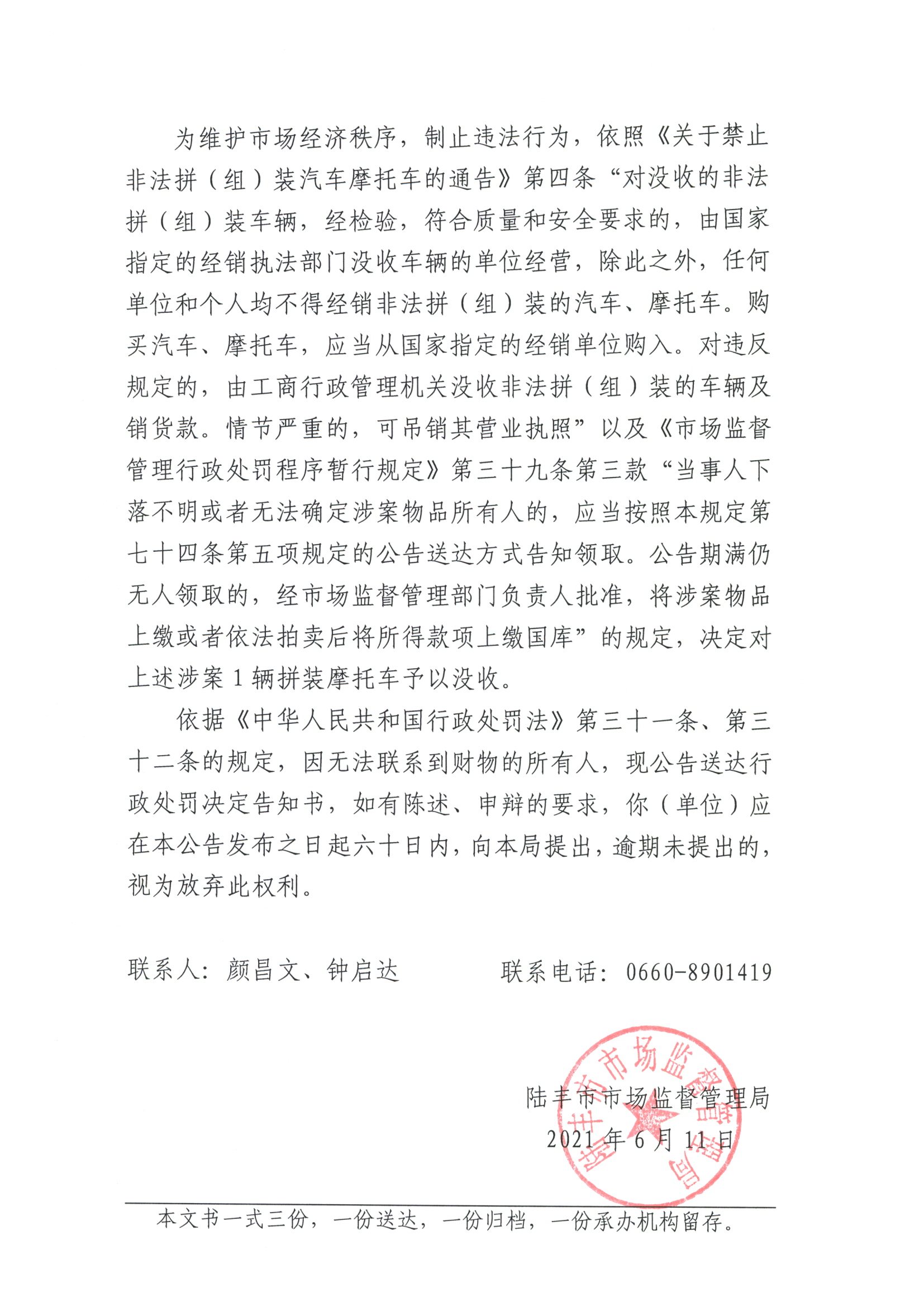 陸豐市市場監(jiān)督管理局無人認(rèn)領(lǐng)財物行政處罰決定告知公告