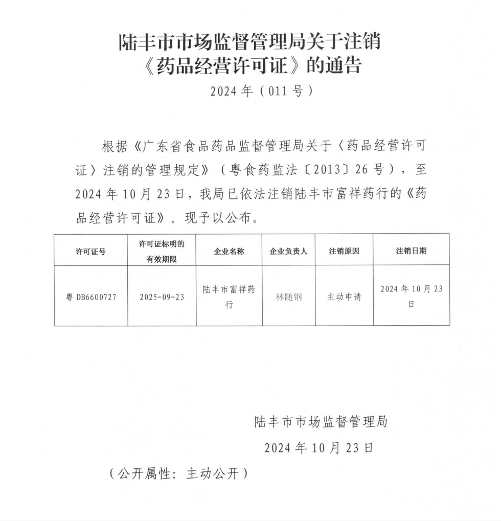 陸豐市市場(chǎng)監(jiān)督管理局關(guān)于注銷(xiāo)《藥品經(jīng)營(yíng)許可證》的通告