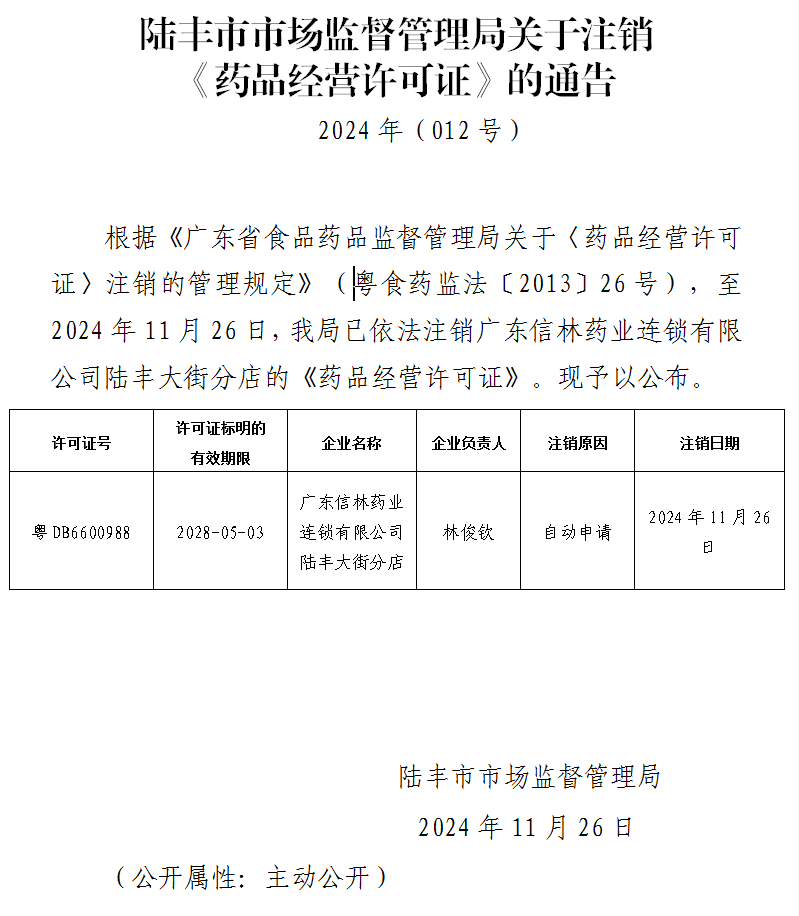 陸豐市市場監(jiān)督管理局關(guān)于注銷《藥品經(jīng)營許可證》的通告