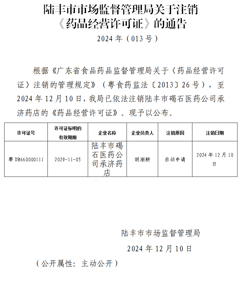 陸豐市市場(chǎng)監(jiān)督管理局關(guān)于注銷(xiāo)《藥品經(jīng)營(yíng)許可證》的通告