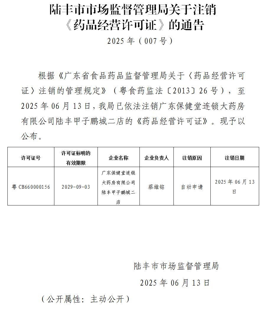 陸豐市市場監(jiān)督管理局關(guān)于注銷《藥品經(jīng)營許可證》的通告