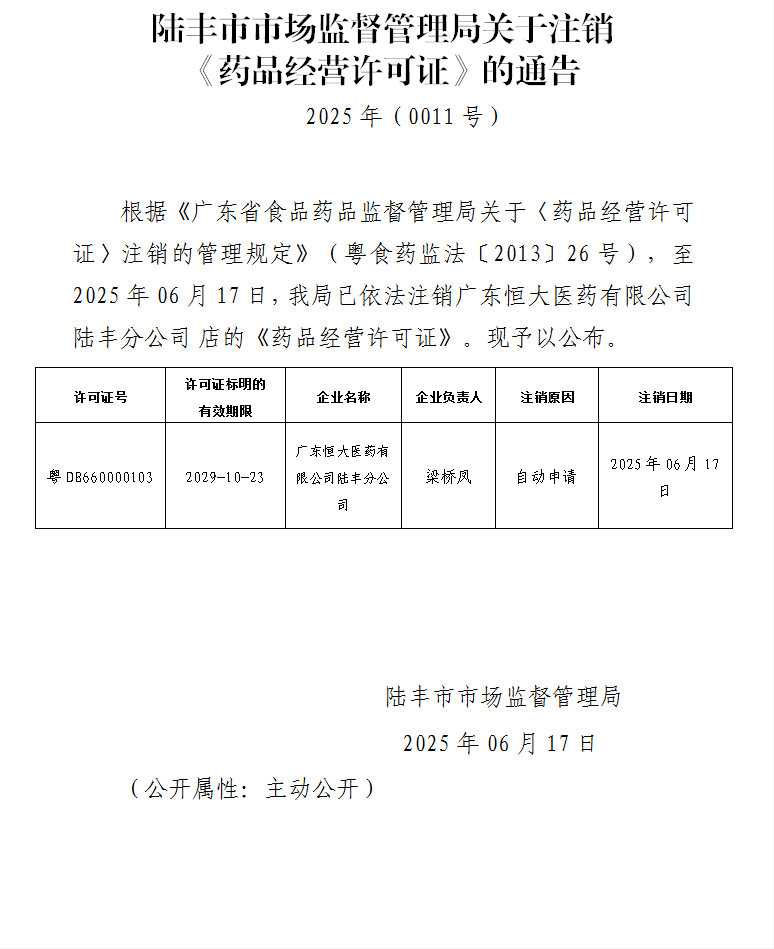 陸豐市市場監(jiān)督管理局關(guān)于注銷《藥品經(jīng)營許可證》的通告