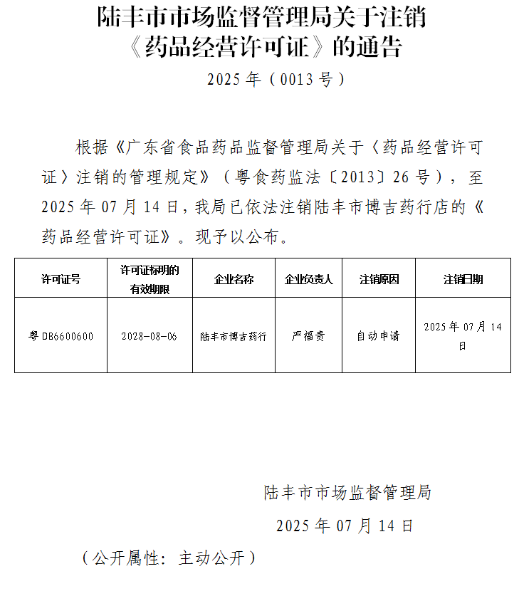 陸豐市市場監(jiān)督管理局關(guān)于注銷《藥品經(jīng)營許可證》的通告