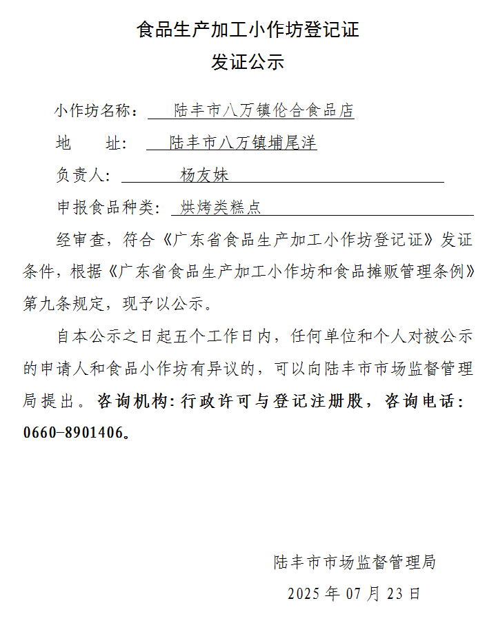 食品生產(chǎn)加工小作坊登記證發(fā)證公示