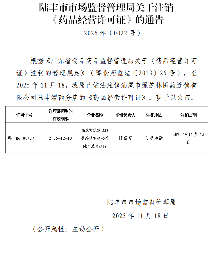 陸豐市市場監(jiān)督管理局關于注銷《藥品經營許可證》的通告
