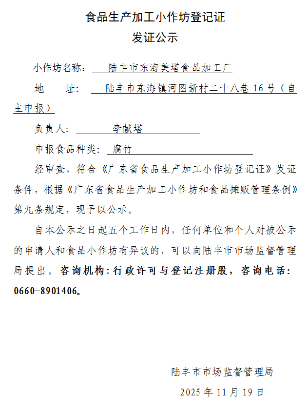 食品生產(chǎn)加工小作坊登記證發(fā)證公示