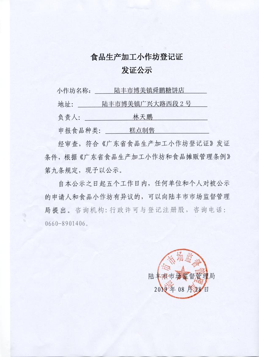 食品生產(chǎn)加工小作坊登記證發(fā)證公示(陸豐市博美鎮(zhèn)舜鵬糖餅店)