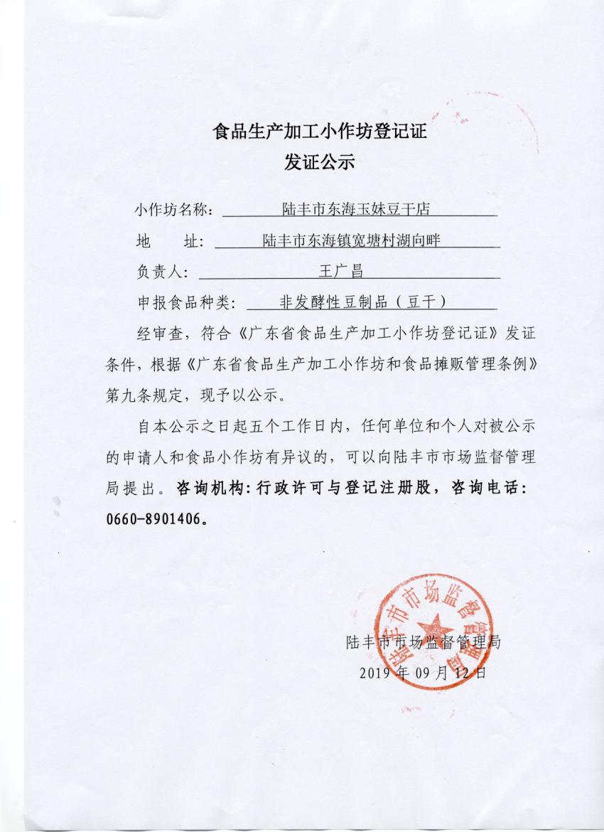 食品生產(chǎn)加工小作坊登記證發(fā)證公示(陸豐市東海玉妹豆干店)