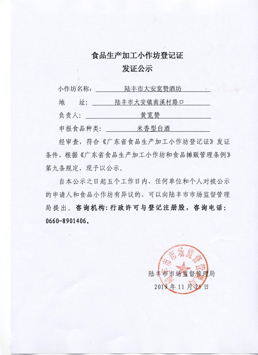 食品生產加工小作坊登記證發(fā)證公示(陸豐市大安寬贊酒坊)