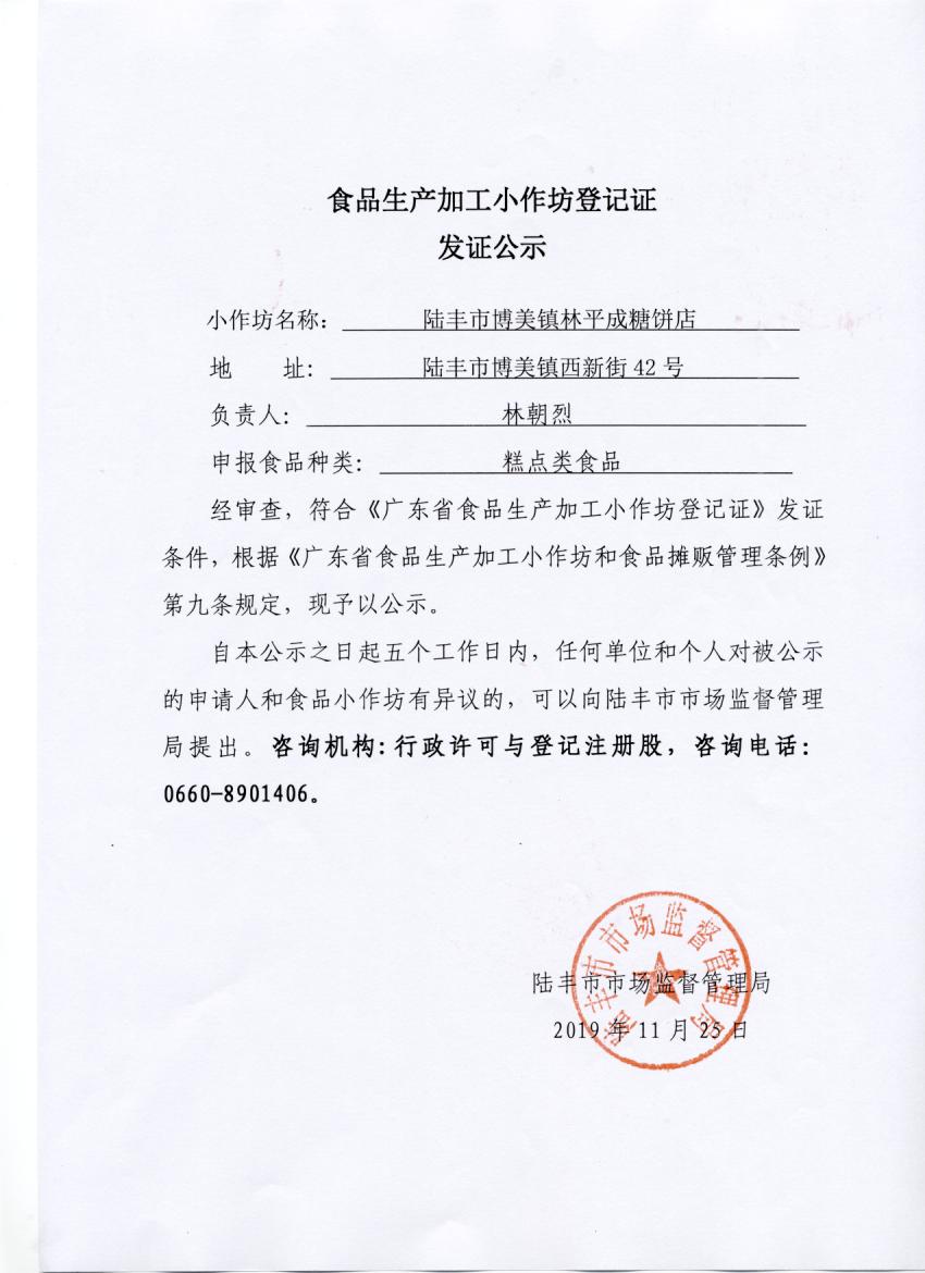 食品生產(chǎn)加工小作坊登記證發(fā)證公示(陸豐市博美鎮(zhèn)林平成糖餅店)