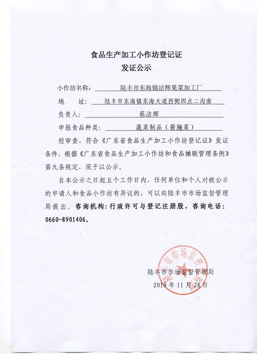 食品生產(chǎn)加工小作坊登記證發(fā)證公示(陸豐市東海鎮(zhèn)潔輝果菜加工廠)