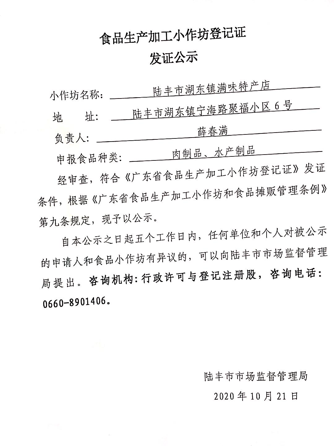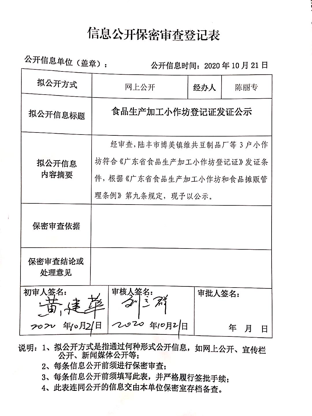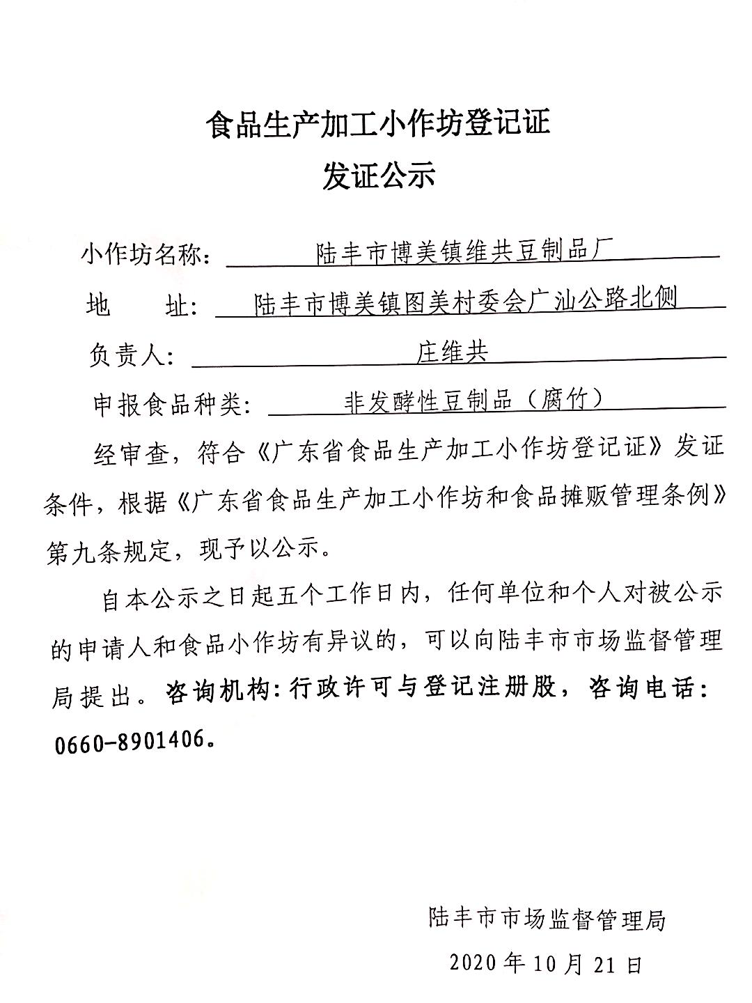 食品生產(chǎn)加工小作坊登記證發(fā)證公示