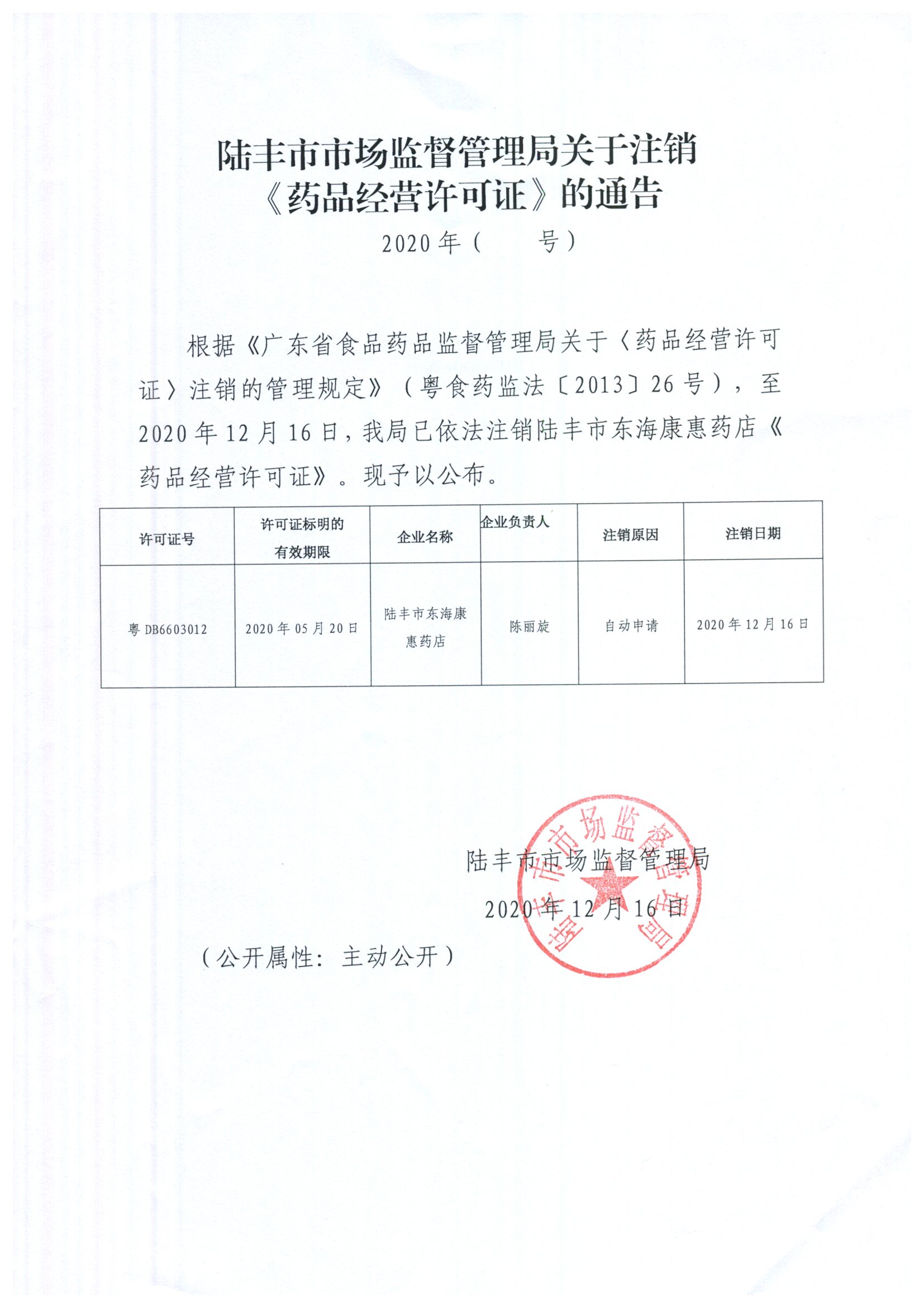 陸豐市市場監(jiān)督管理局關(guān)于注銷《藥品經(jīng)營許可證》的通告