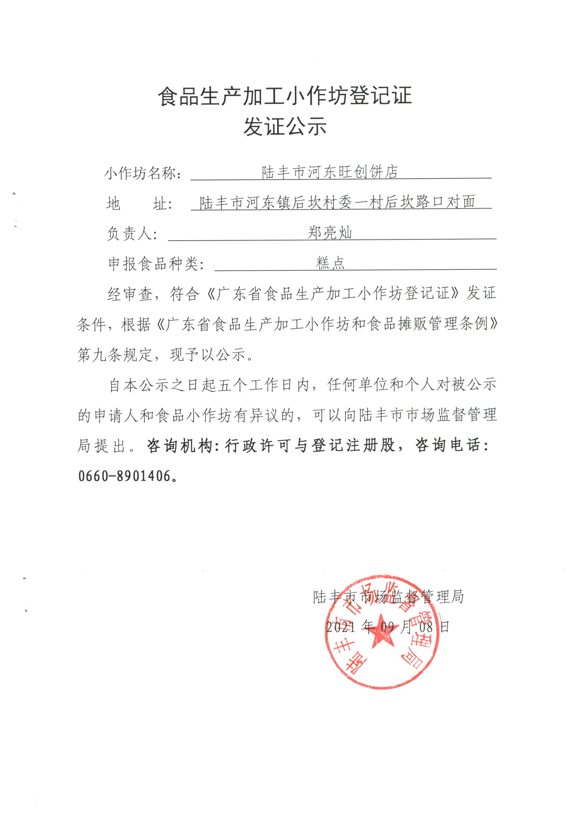 經(jīng)審查,陸豐市河?xùn)|旺創(chuàng)餅店等2個(gè)小作坊符合《廣東省食品生產(chǎn)加工小作坊登記證》發(fā)證條件,根據(jù)《廣東省食品生產(chǎn)加工小作坊和食品攤販管理?xiàng)l例》第九條規(guī)定,現(xiàn)予以公示。