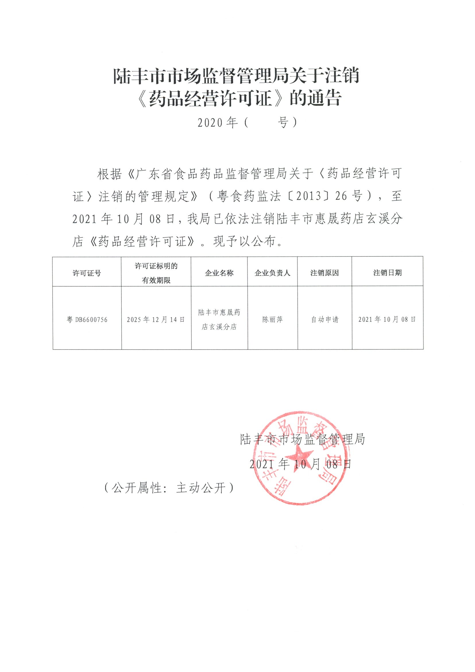陸豐市市場監(jiān)督管理局關于注銷《藥品經營許可證》的通告