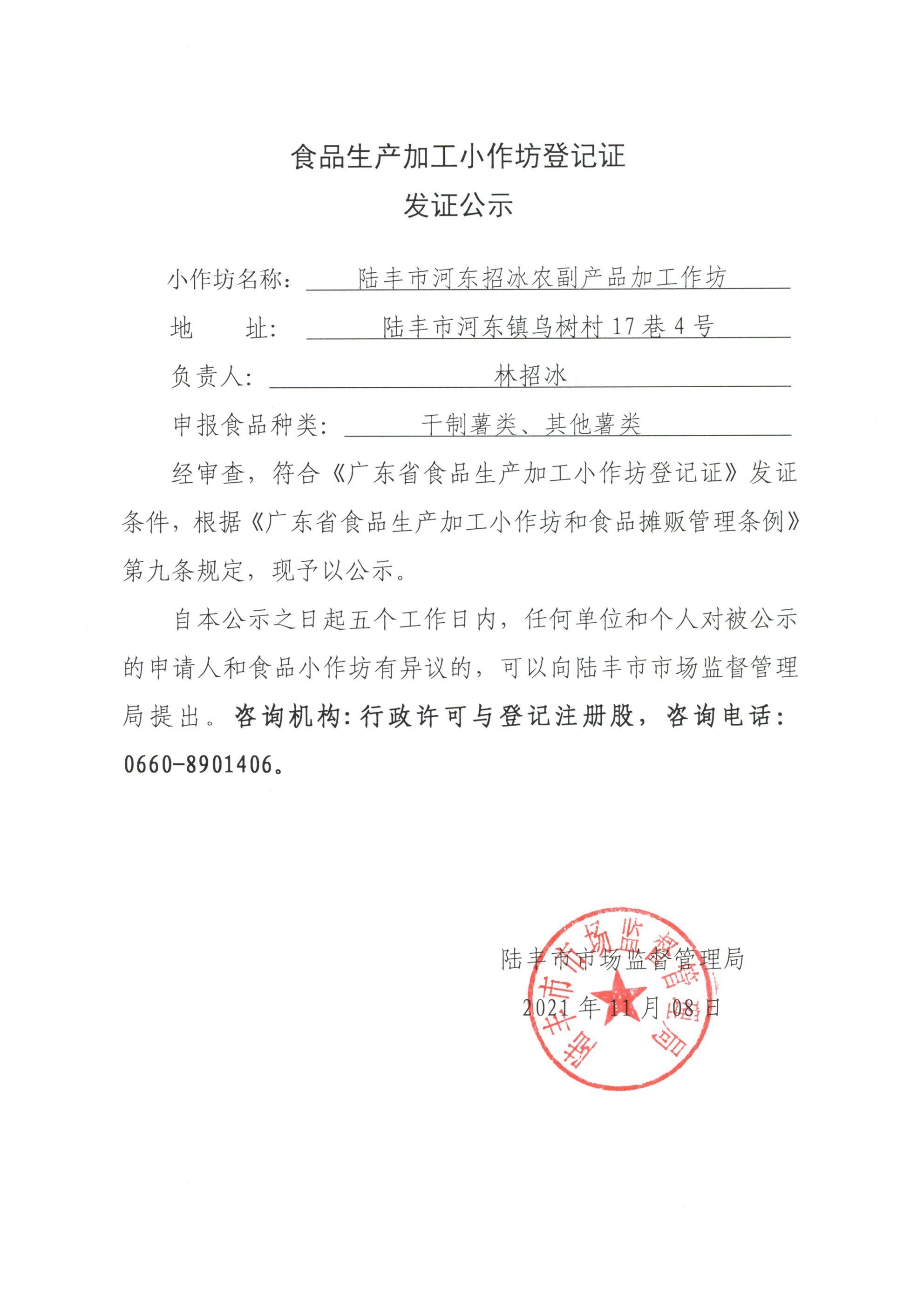經(jīng)審查,陸豐市河?xùn)|招冰農(nóng)副產(chǎn)品加工作坊符合《廣東省食品生產(chǎn)加工小作坊登記證》發(fā)證條件,根據(jù)《廣東省食品生產(chǎn)加工小作坊和食品攤販管理條例》第九條規(guī)定,現(xiàn)予以公示。