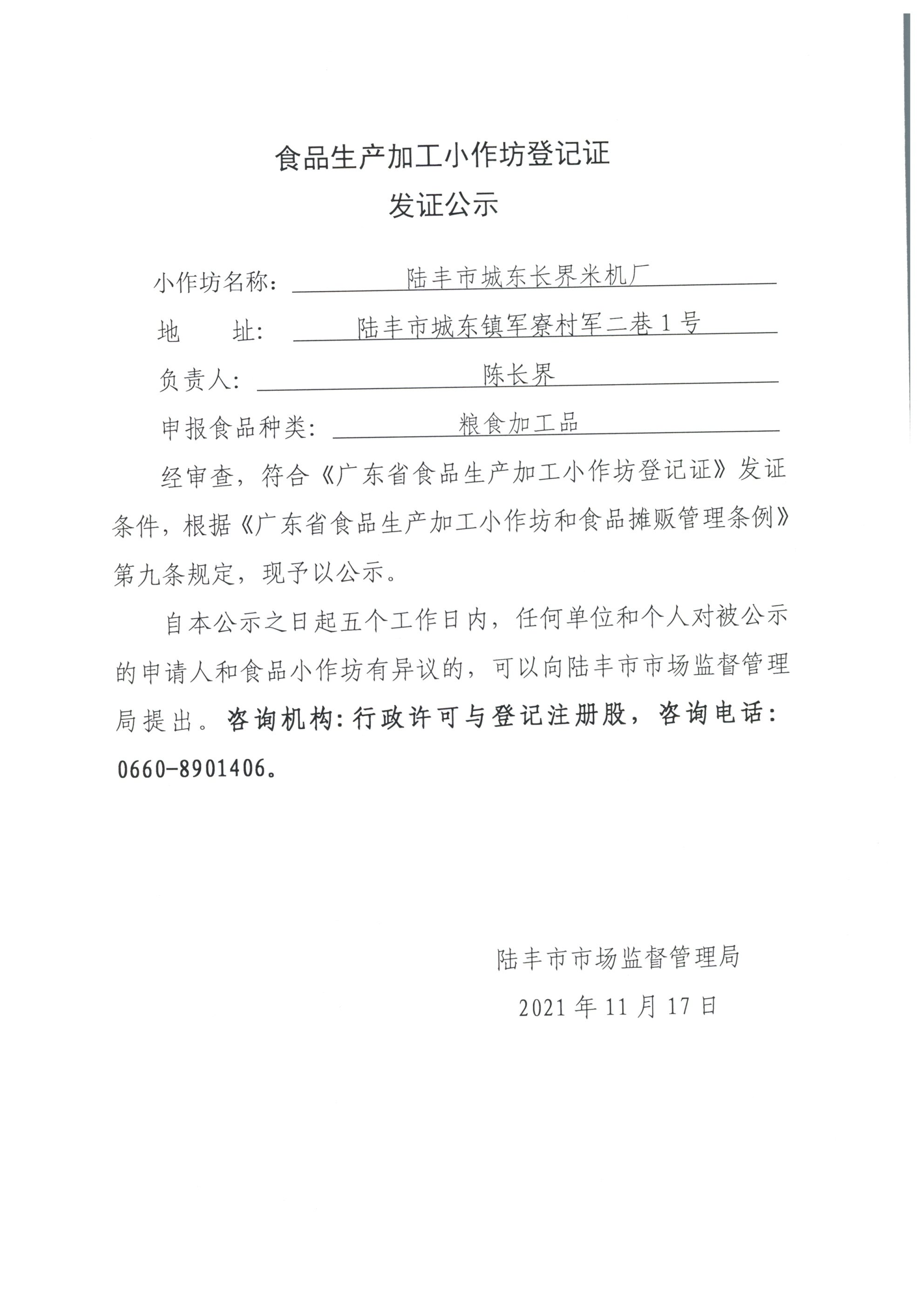 經(jīng)審查,陸豐市城東長(zhǎng)界米機(jī)廠符合《廣東省食品生產(chǎn)加工小作坊登記證》發(fā)證條件,根據(jù)《廣東省食品生產(chǎn)加工小作坊和食品攤販管理?xiàng)l例》第九條規(guī)定,現(xiàn)予以公示。