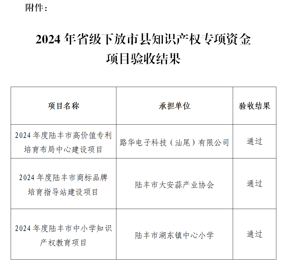 陸豐市市場(chǎng)監(jiān)督管理局關(guān)于2024年省級(jí)下放市縣知識(shí)產(chǎn)權(quán)專項(xiàng)資金項(xiàng)目驗(yàn)收結(jié)果的公示