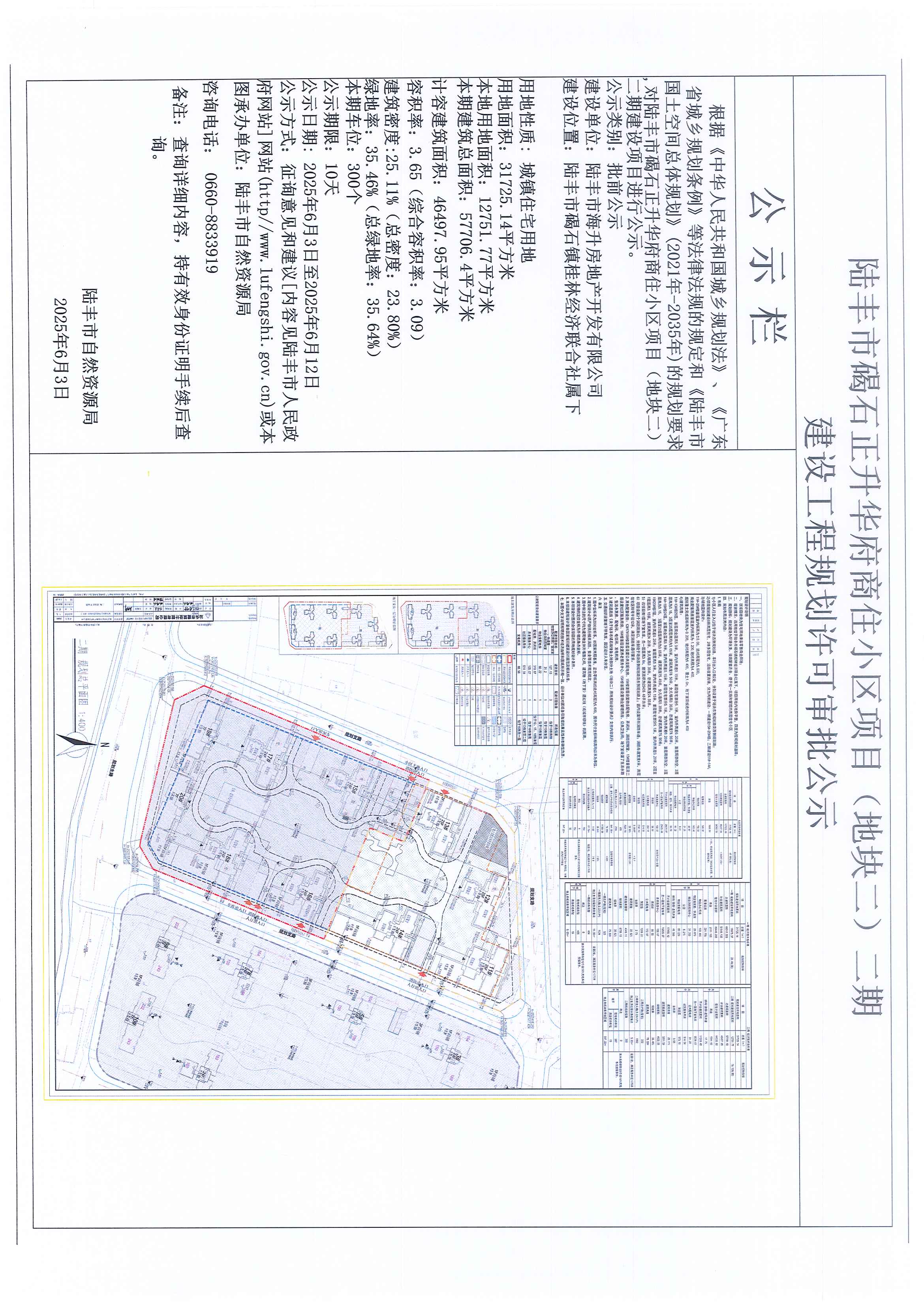 陸豐市碣石正升華府商住小區(qū)項目(地塊二)二期建設工程規(guī)劃許可審批公示