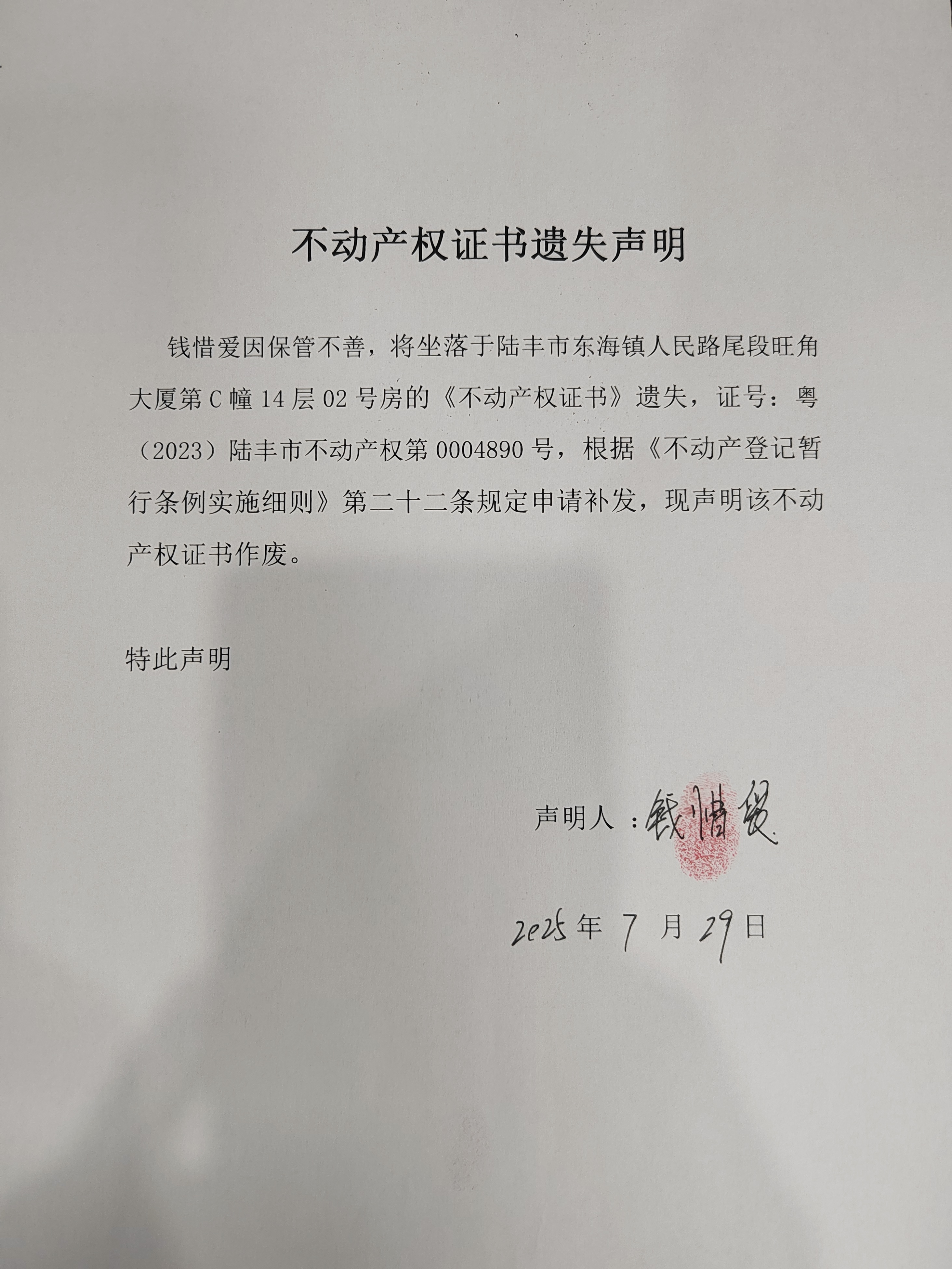 1 | 粵(2023)陸豐市不動產(chǎn)權(quán)第0004890號 | 錢惜愛 | 商品房 | 441581001007GB00080F00010154 | 陸豐市東海鎮(zhèn)人民路尾段旺角大廈第C幢14層02號房 |