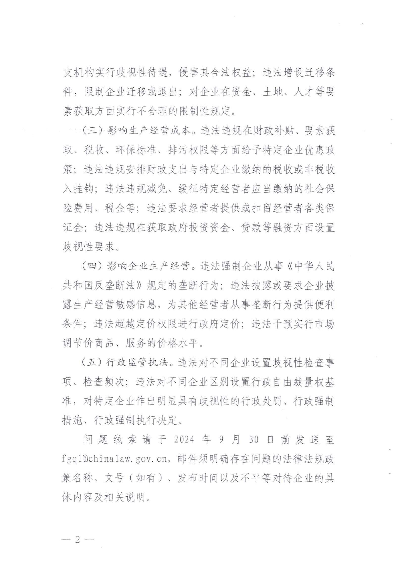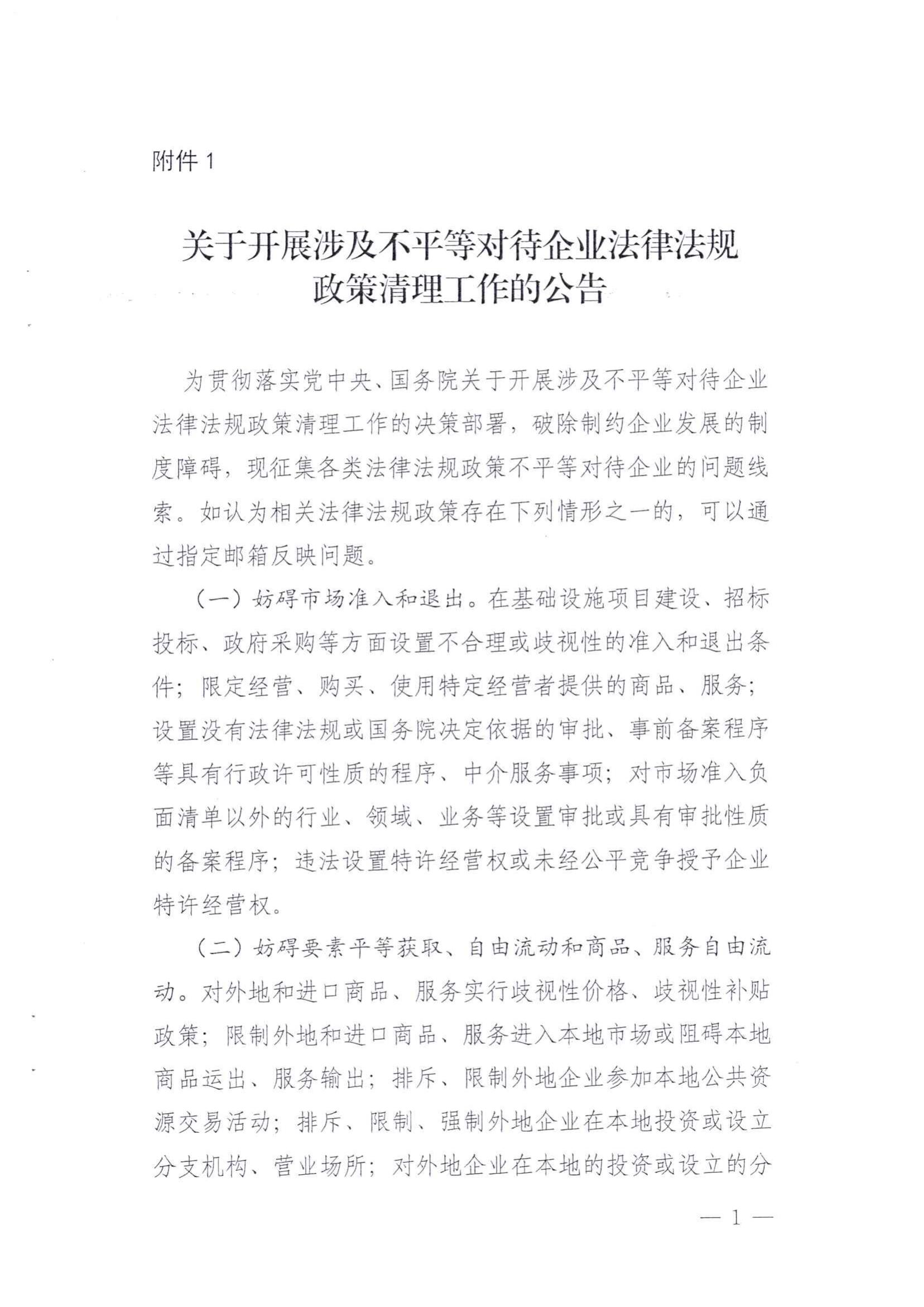 關(guān)于開(kāi)展涉及不平等對(duì)待企業(yè)法律法規(guī)政策清理工作的公告
