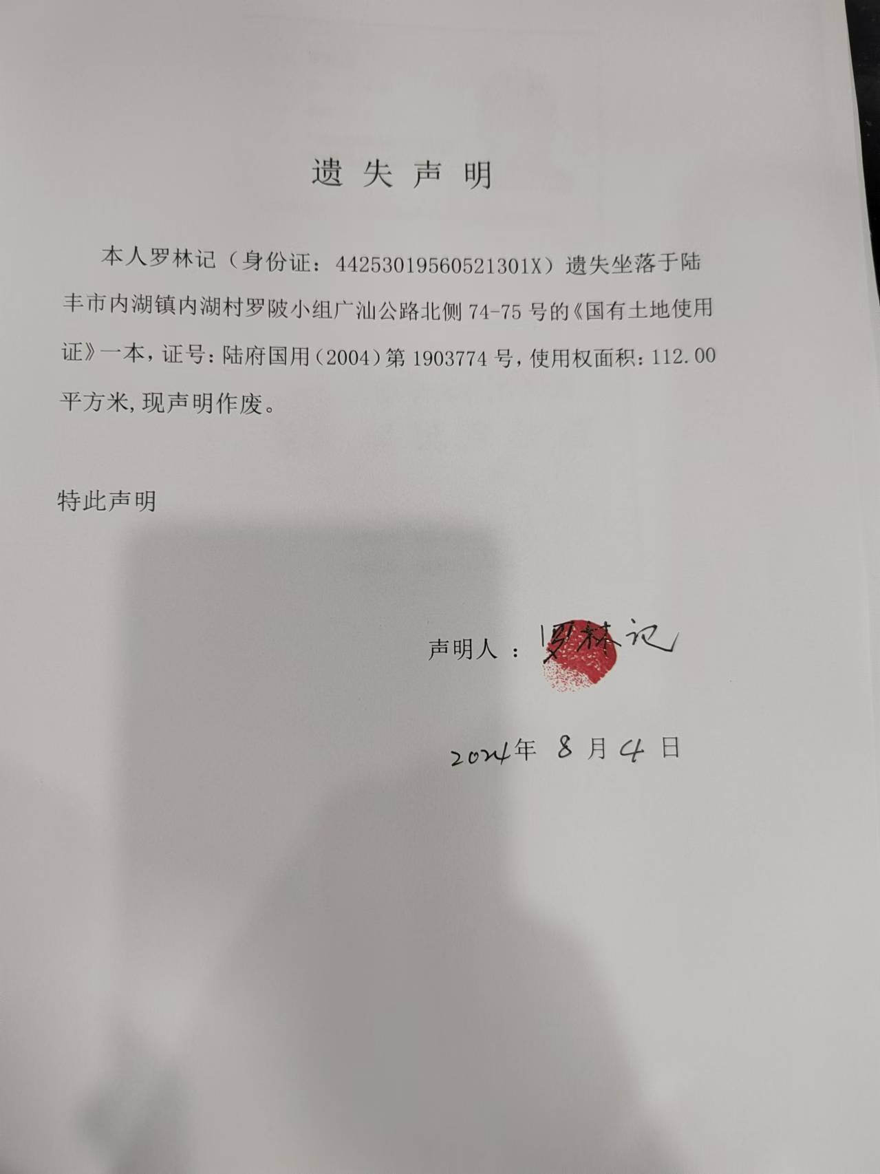 本人羅林記(身份證:442530********301X)遺失坐落于陸豐市內(nèi)湖鎮(zhèn)內(nèi)湖村羅陂小組廣汕公路北側(cè)74-75號的《國用土地使用證》一本,證號:陸府國用(2004)第1903774號,現(xiàn)聲明作廢。