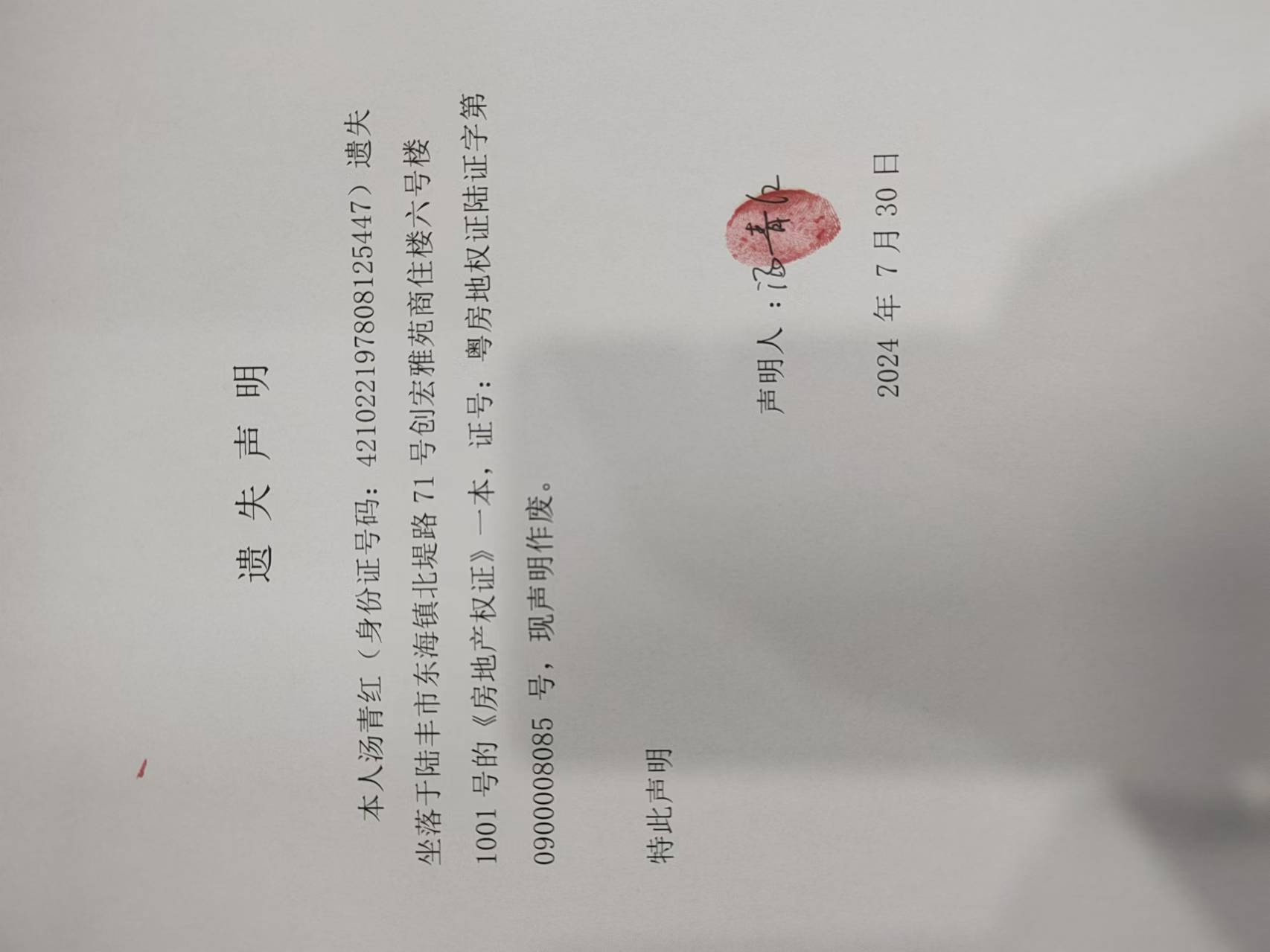 遺失聲明:本人湯青紅遺失坐落陸豐市東海鎮(zhèn)北堤路71號創(chuàng)宏雅苑商住樓六號樓1001號的《房地產(chǎn)權(quán)證》一本,證號:粵房地權(quán)證陸證字第0900008085 號,現(xiàn)聲明作廢。