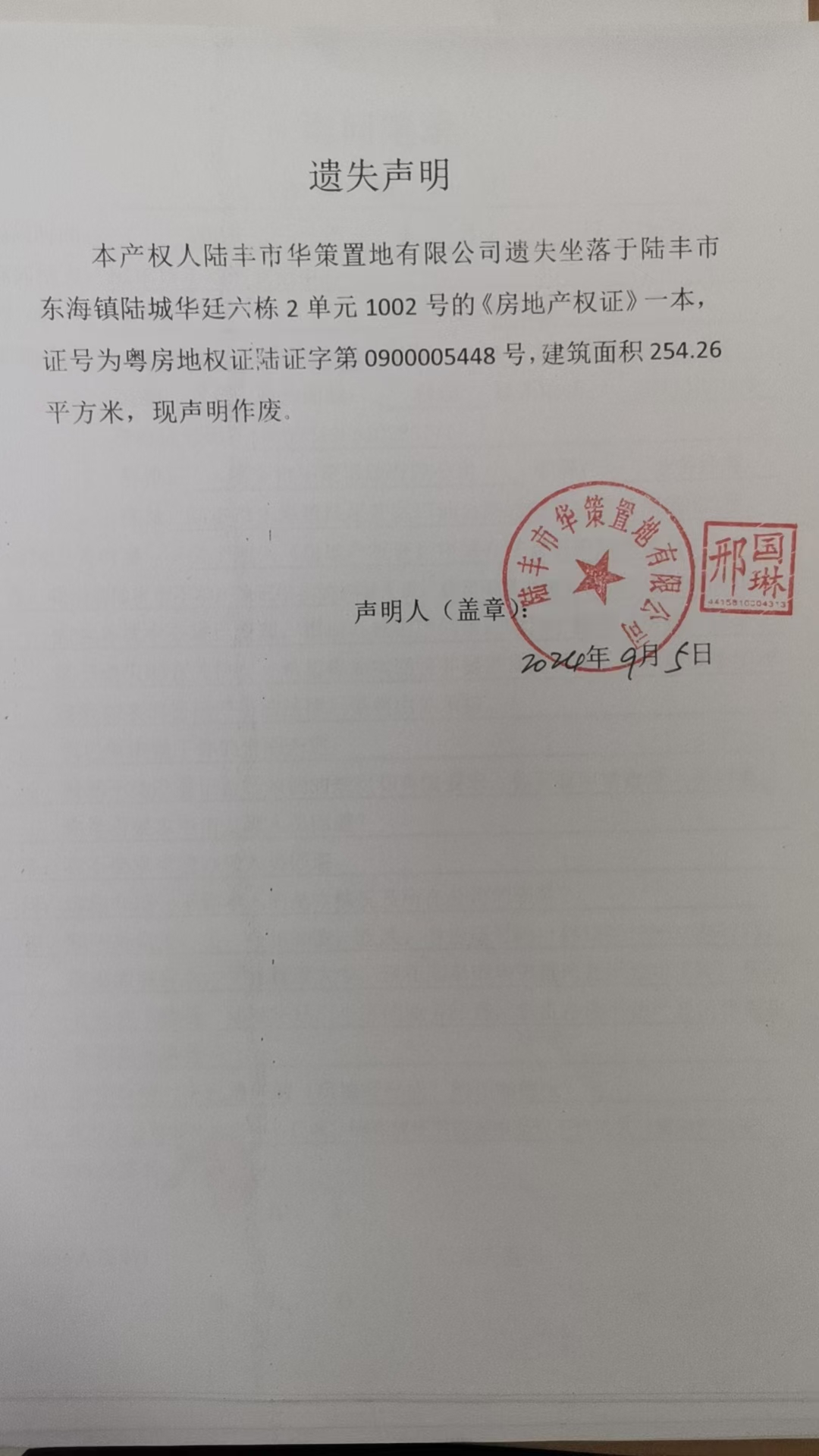 遺失聲明工:本產(chǎn)權(quán)人陸豐市華策置地有限公司遺失坐落于陸豐市東海鎮(zhèn)陸城華廷六棟2單元1002號(hào)的《房地產(chǎn)權(quán)證》一本,證號(hào)為粵房地權(quán)證陸證字第0900005448號(hào),建筑面積254.26平方米,現(xiàn)聲明作廢。