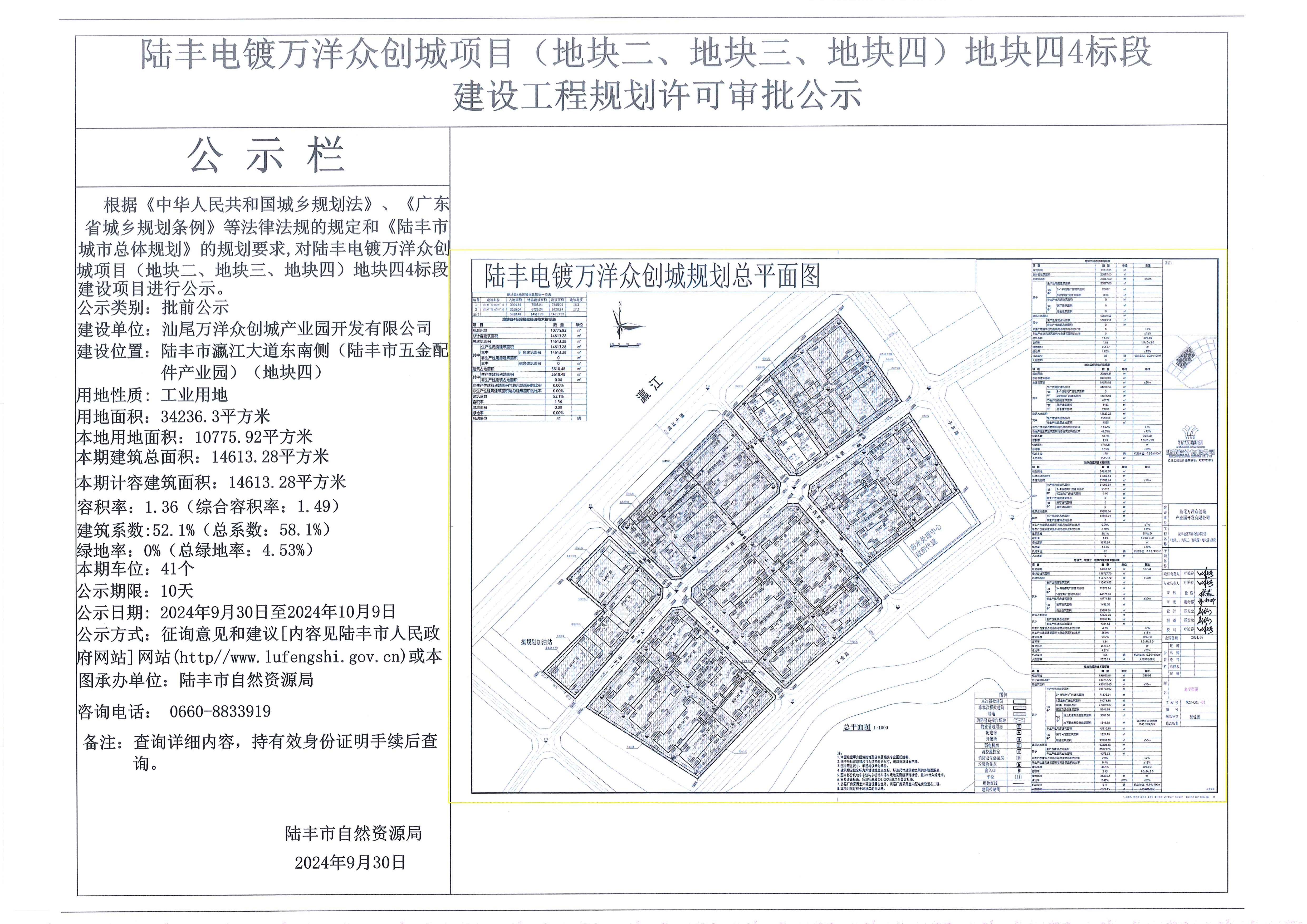 陸豐電鍍?nèi)f洋眾創(chuàng)城項目(地塊二、地塊三、地塊四)地塊四4標(biāo)段建設(shè)工程規(guī)劃許可審批公示