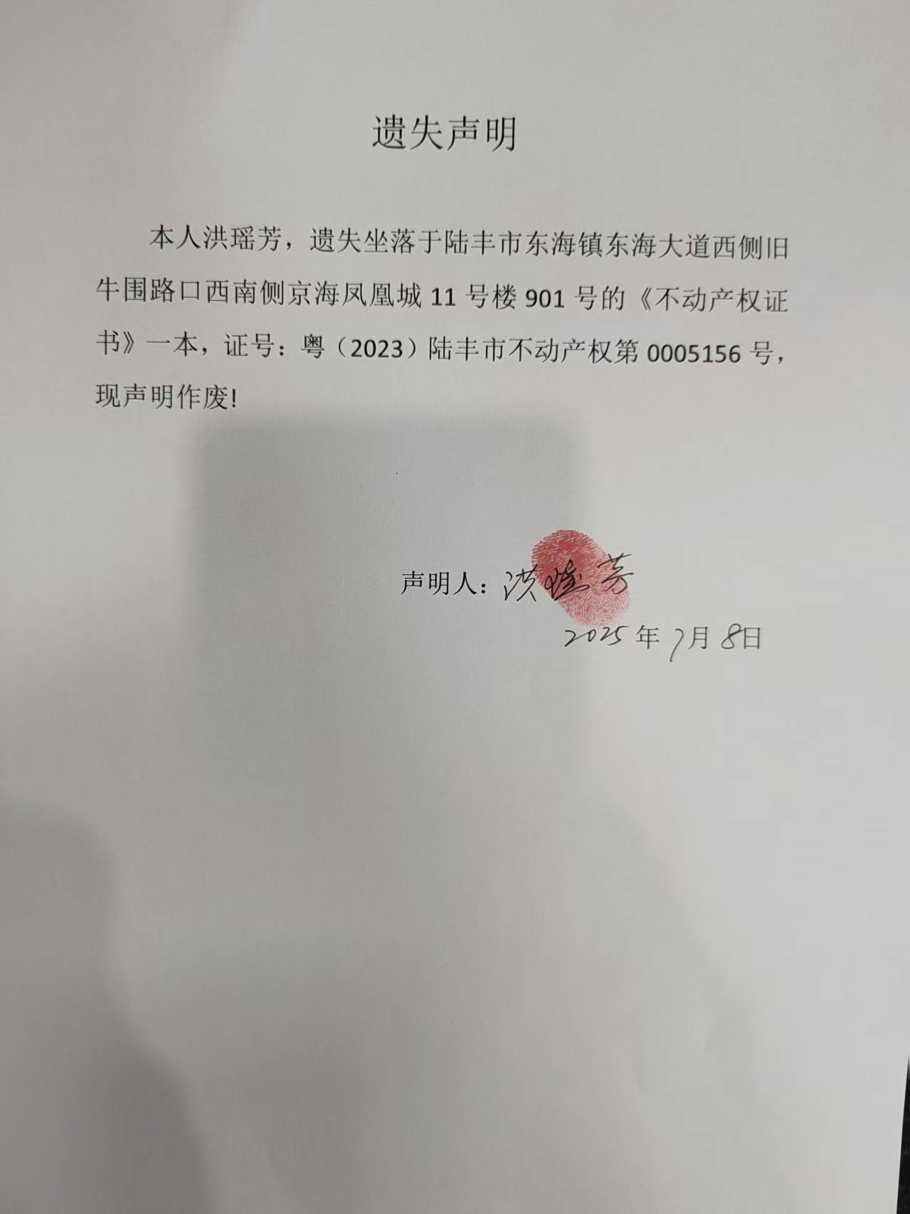 遺失聲明:本人洪瑤芳,遺失坐落于陸豐市東海鎮(zhèn)東海大道西側(cè)舊牛圍路口西南側(cè)京海鳳凰城11號樓901號的《不動產(chǎn)權(quán)證書》一本,證號為粵(2023)陸豐市不動產(chǎn)權(quán)第0005156號,現(xiàn)聲明作廢!