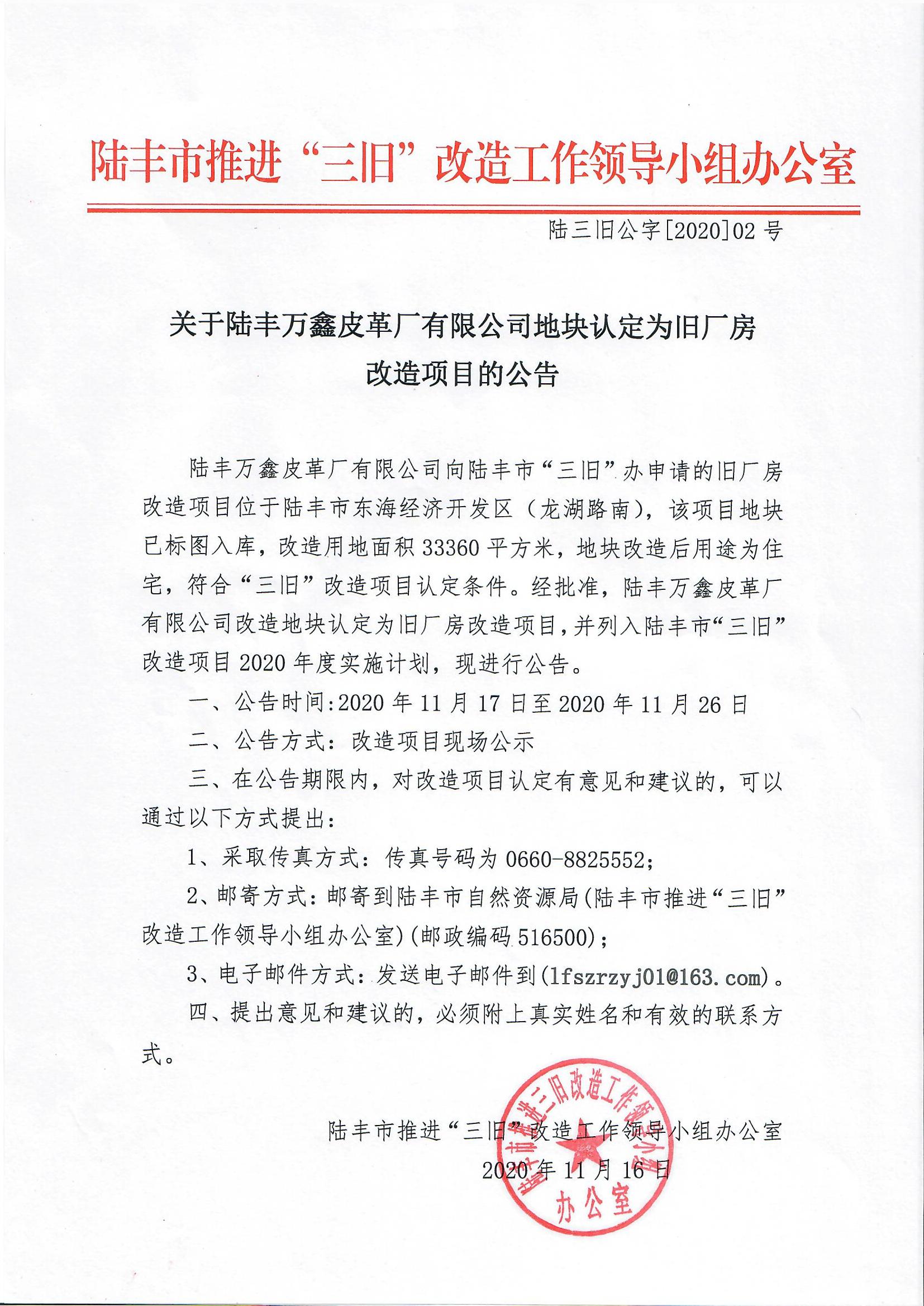 關(guān)于陸豐萬鑫皮革廠有限公司地塊認(rèn)定為舊廠房改造項(xiàng)目的公告