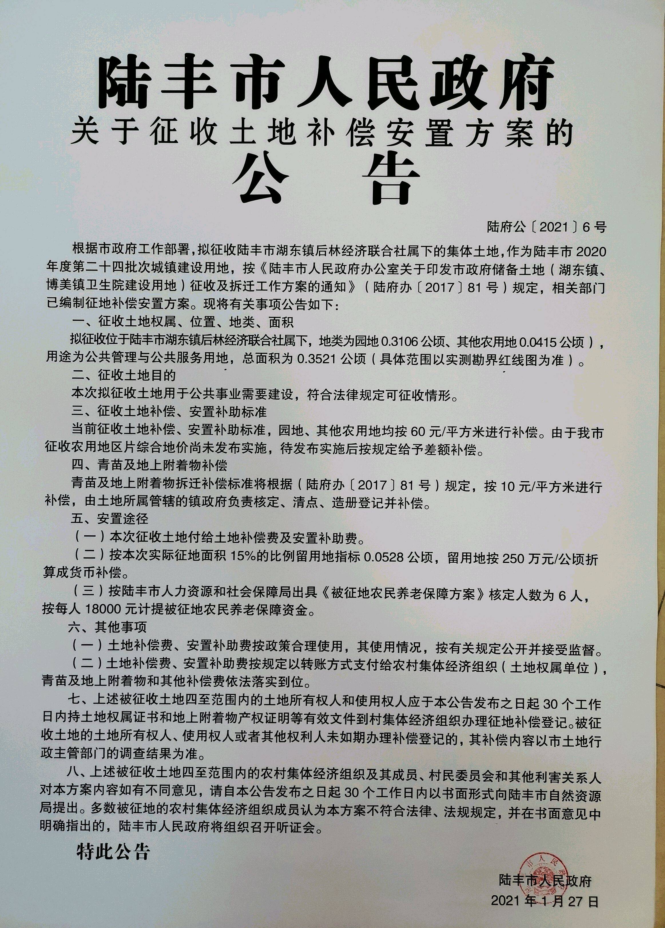 陸豐市人民政府關于征收土地補償安置方案的公告(陸府公[2021]6號)