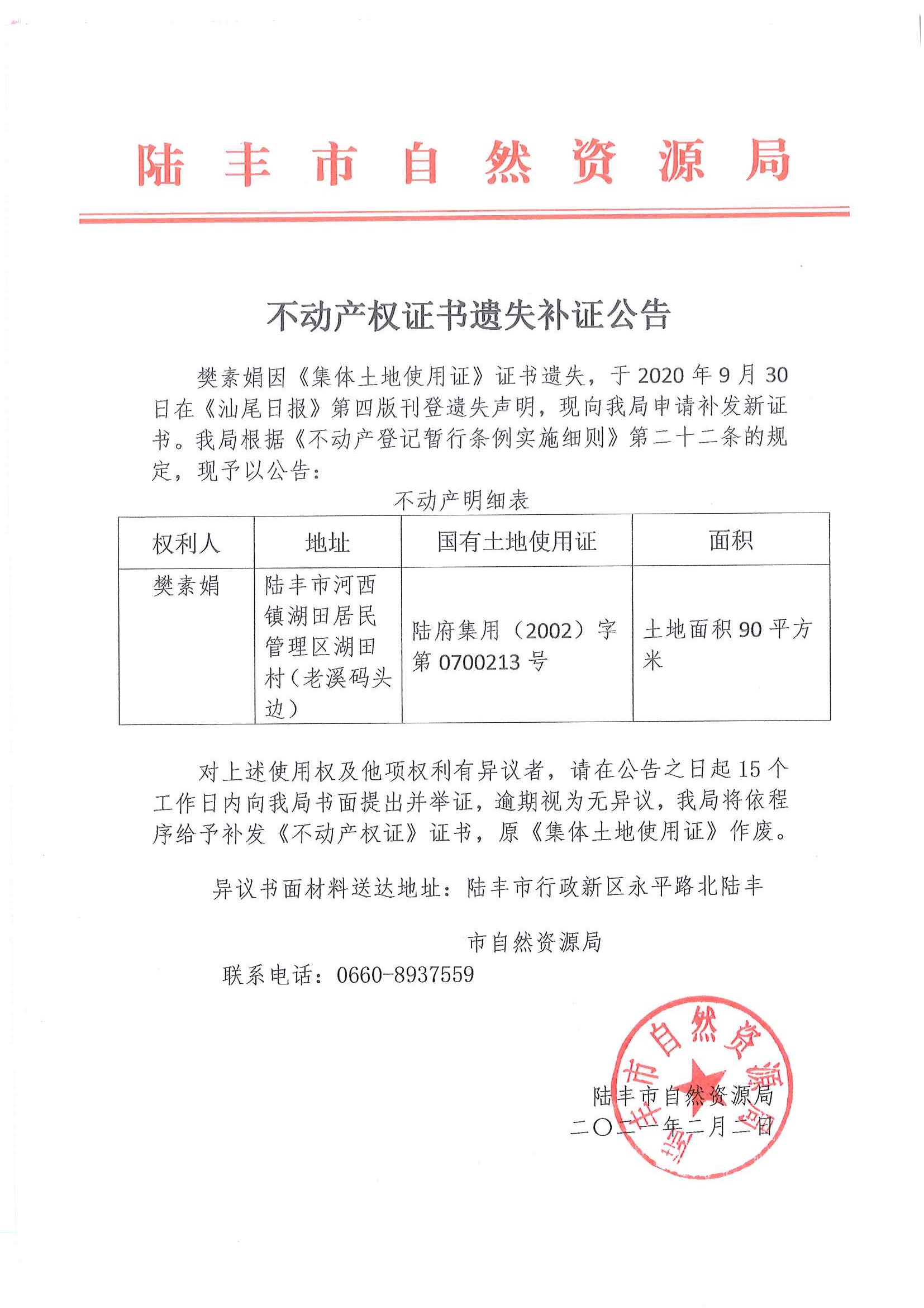 不動產(chǎn)權(quán)證書遺失補(bǔ)證公告(樊素娟)