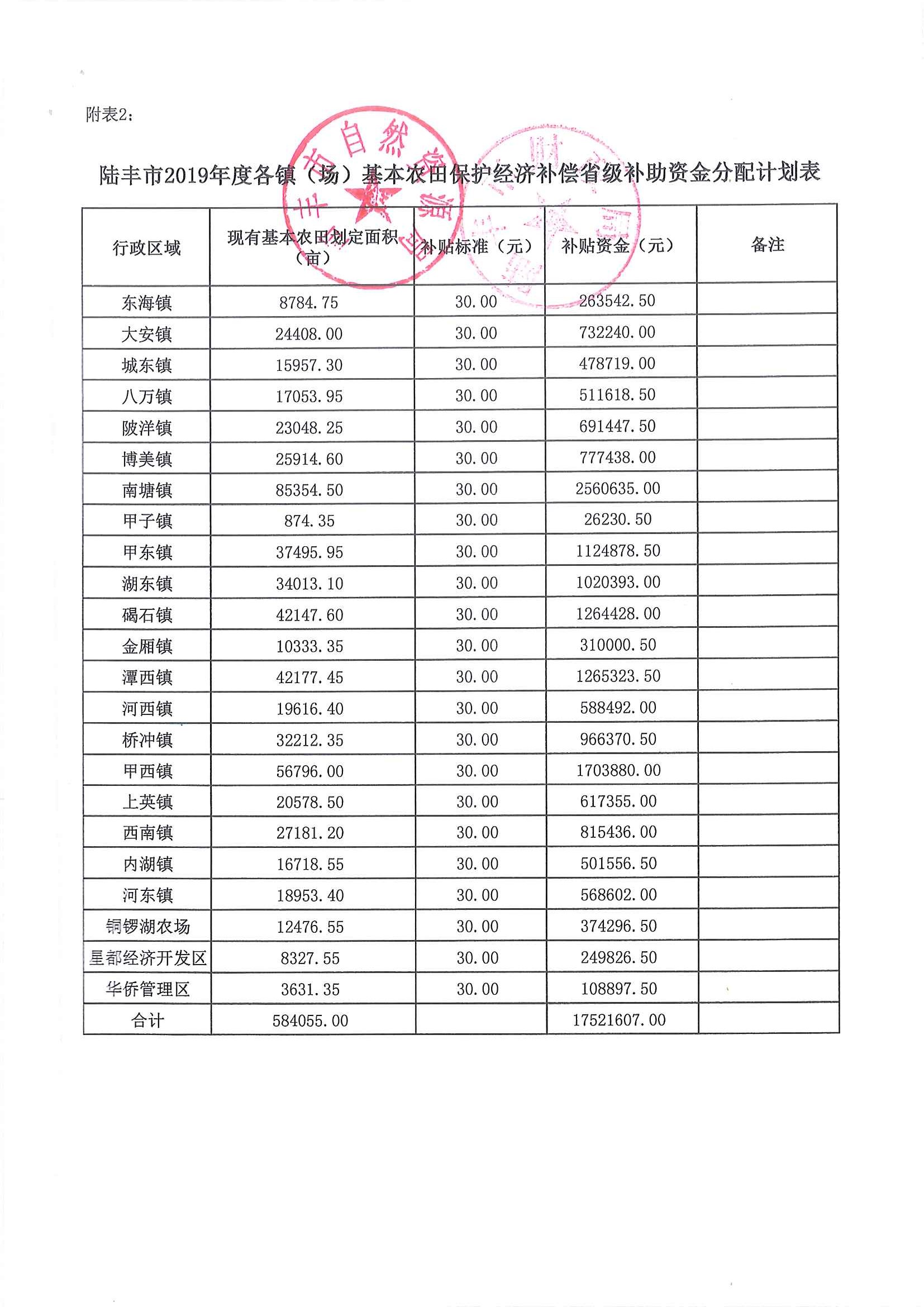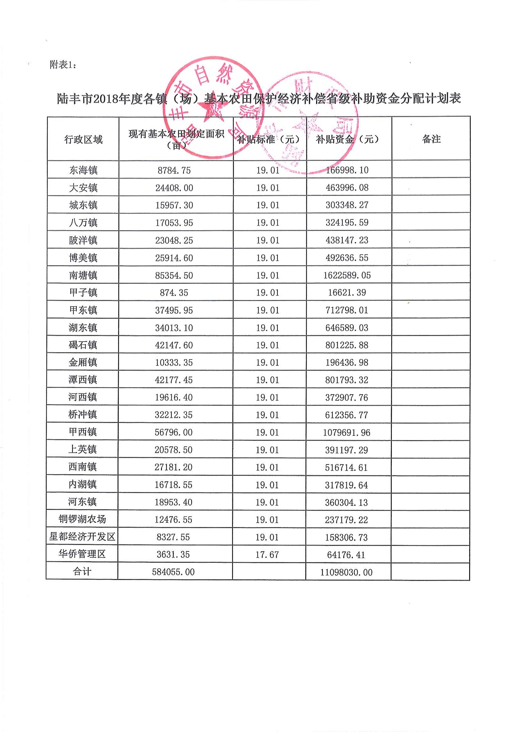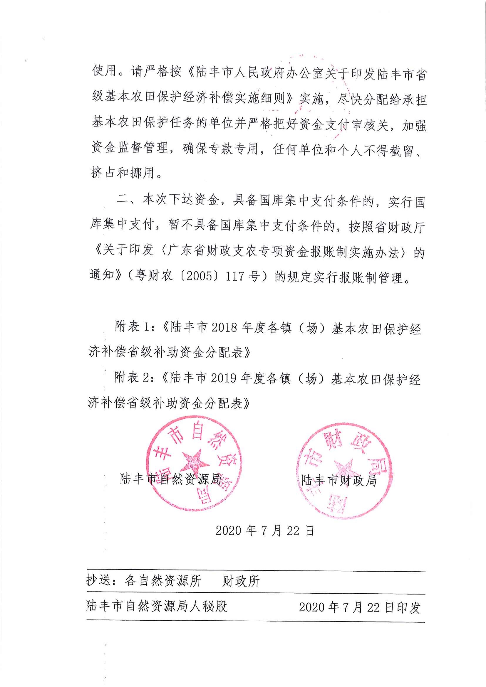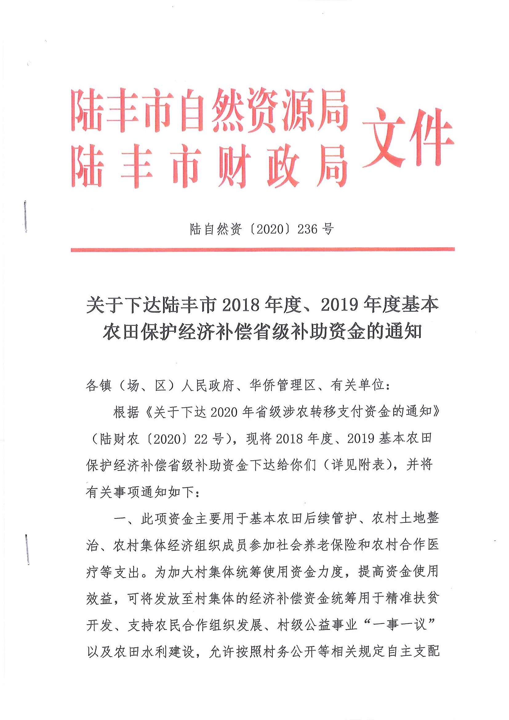 關(guān)于下達陸豐市2018年度、2019年度基本農(nóng)田保護經(jīng)濟補償省級補助資金的通知