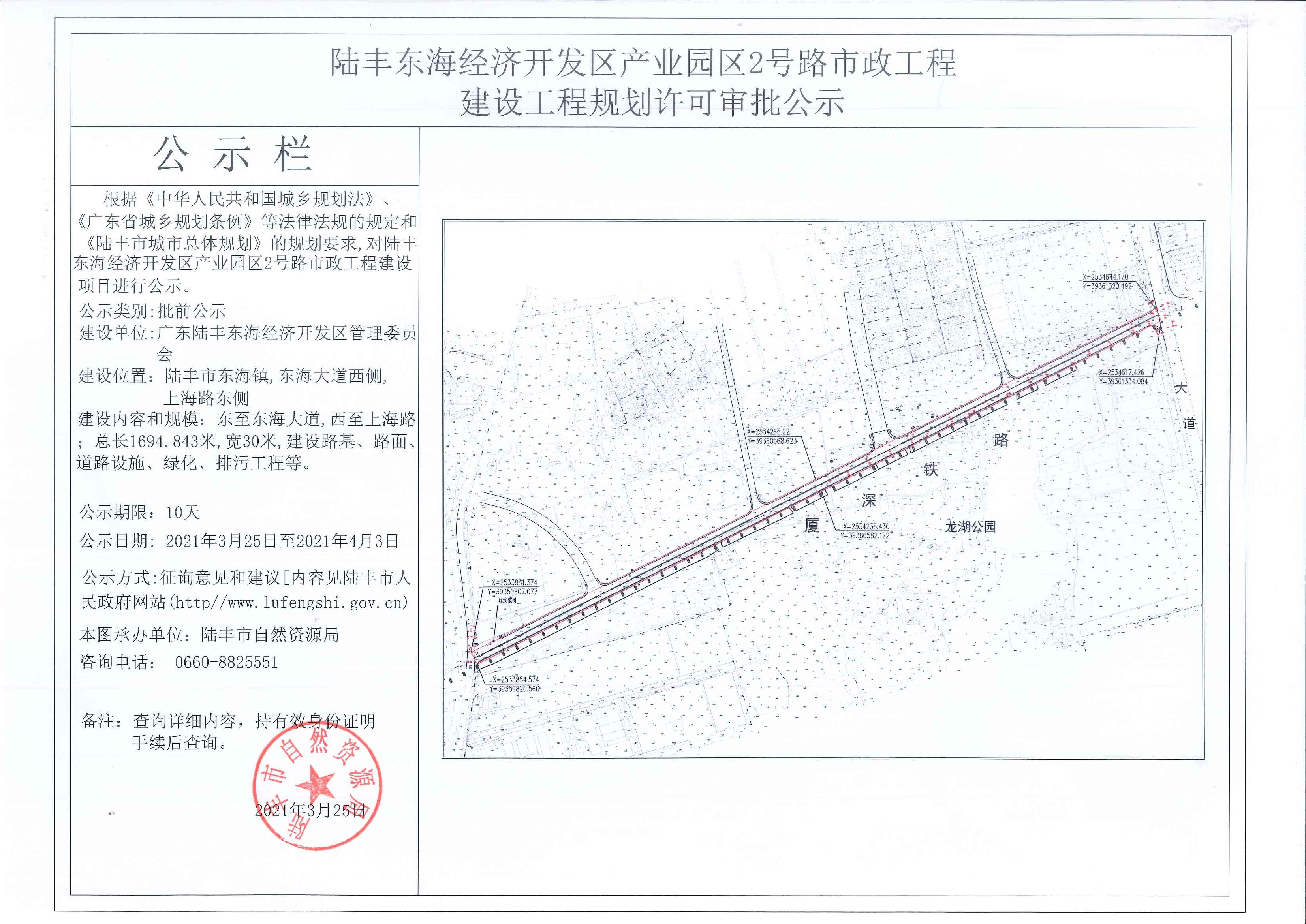 陸豐東海經(jīng)濟(jì)開(kāi)發(fā)區(qū)產(chǎn)業(yè)園區(qū)2號(hào)路市政工程建設(shè)工程規(guī)劃許可審批公示