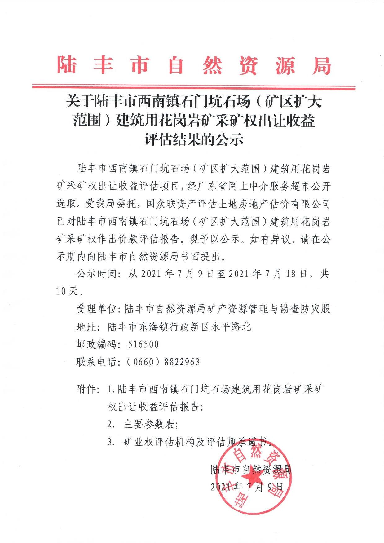 關(guān)于陸豐市西南鎮(zhèn)石門坑石場(chǎng)(礦區(qū)擴(kuò)大范圍)建筑用花崗巖礦采礦權(quán)出讓收益評(píng)估結(jié)果的公示.pdf
