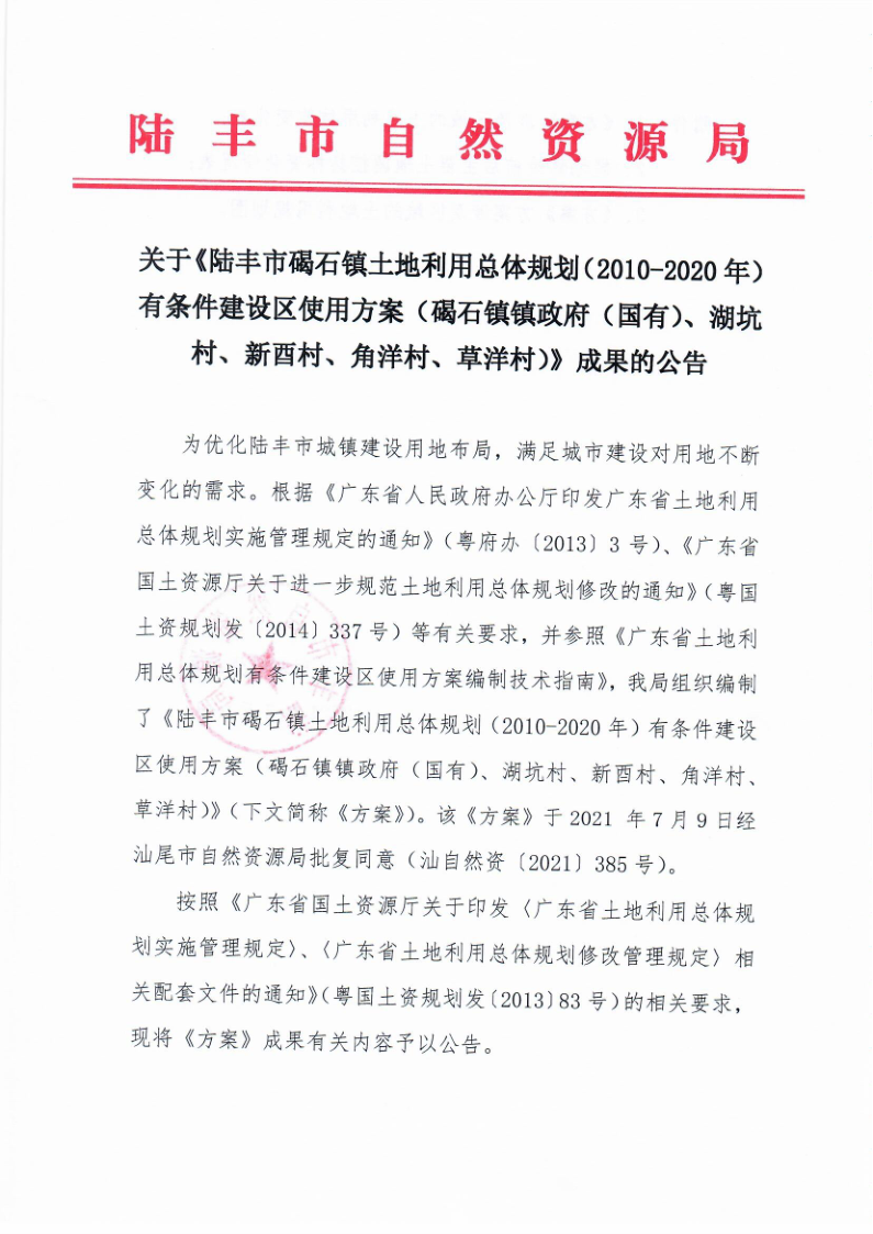 關(guān)于《陸豐市碣石鎮(zhèn)土地利用總體規(guī)劃(2010-2020年)有條件建設(shè)區(qū)使用方案(碣石鎮(zhèn)鎮(zhèn)政府(國有)、湖坑村、新酉村、角洋村、草洋村)》成果