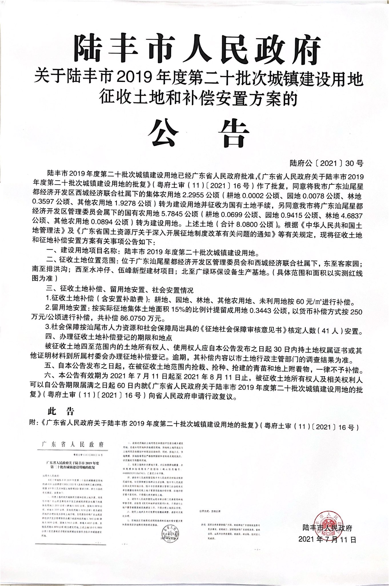 廣東省人民政府關于陸豐市 2019 年度第二十批次城鎮(zhèn)建設用地的批復(粵府土審(11)〔2021〕16號)